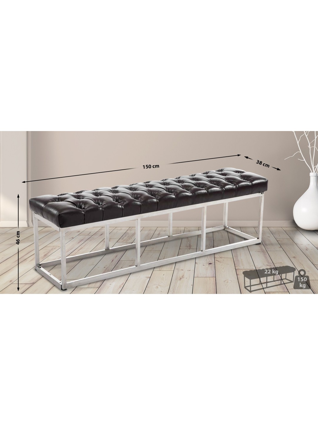 Bænken har en robust ramme i rustfrit stål. Krydstag gør den så stabil, at den sikkert kan belastes med op til 150 kilo. Følsomme gulve bliver ikke beskadiget takket være gulvbeskytterne.