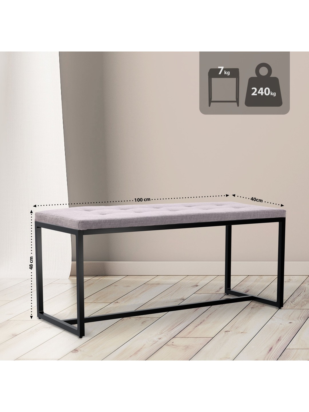 Bænkrammen kan holde op til 240 kg og tilbyder en høj grad af stabilitet takket være fire robuste ben og en tværstiver.