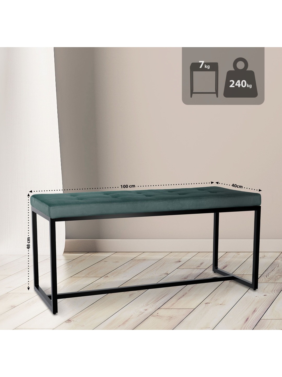 Bænken står stabilt på et firbenet stel. Bænken fås med imiteret læder, fløjl eller stofbetræk. Det robuste håndværk af det pulverlakerede jern garanterer langtidsholdbar kvalitet og pålidelighed.