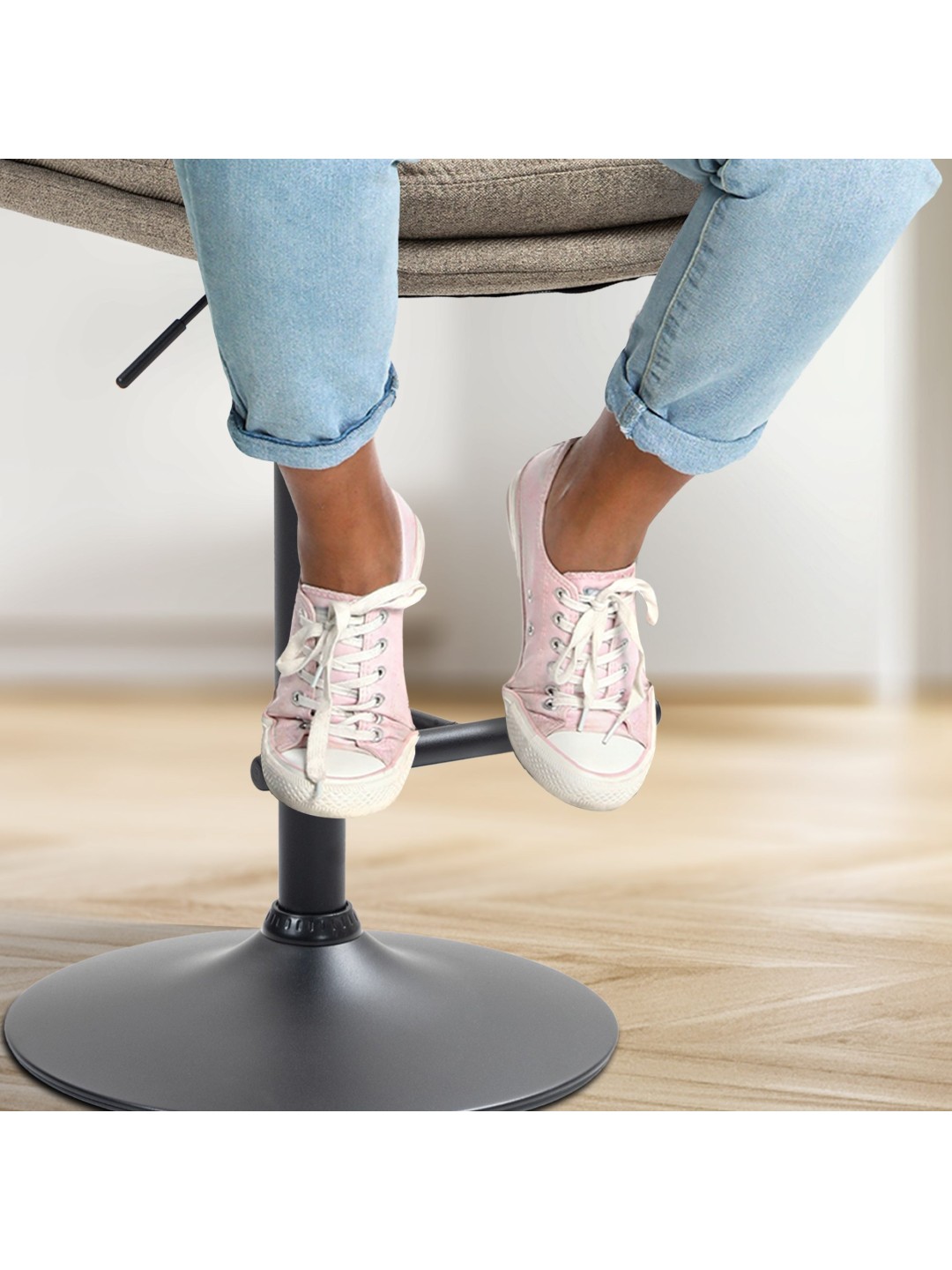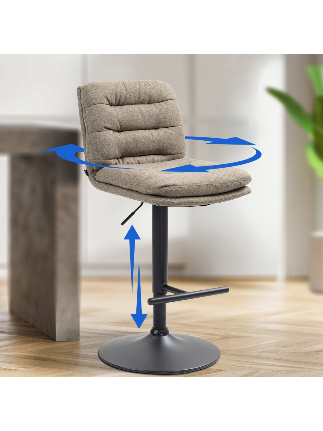 Skamlens stel og det moderigtige betræk giver taburetten et elegant udseende. Sædet er beklædt med et slidstærkt stofbetræk. Metalrammen er højdejusterbar og 360 graders rotationsfunktionen sikrer masser af bevægelsesfrihed.