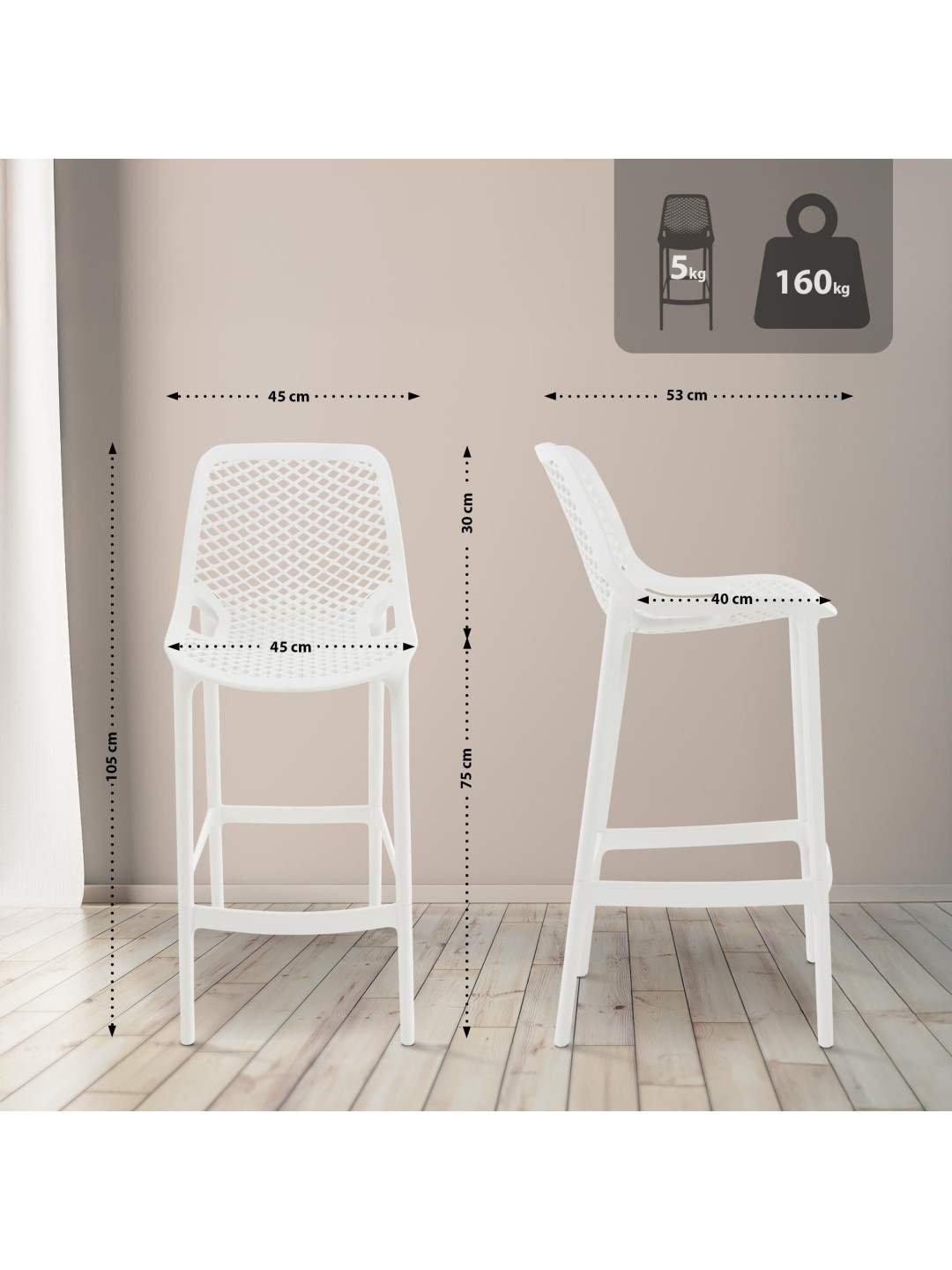 Barstolen Air er lavet af UV-bestandig polypropylen af høj kvalitet og imponerer med sin vejrbestandighed. Det betyder, at stolen ikke kun kan bruges indendørs, men også udendørs. Stolen er derfor også et godt valg som havestol, til terrassen eller altanen.