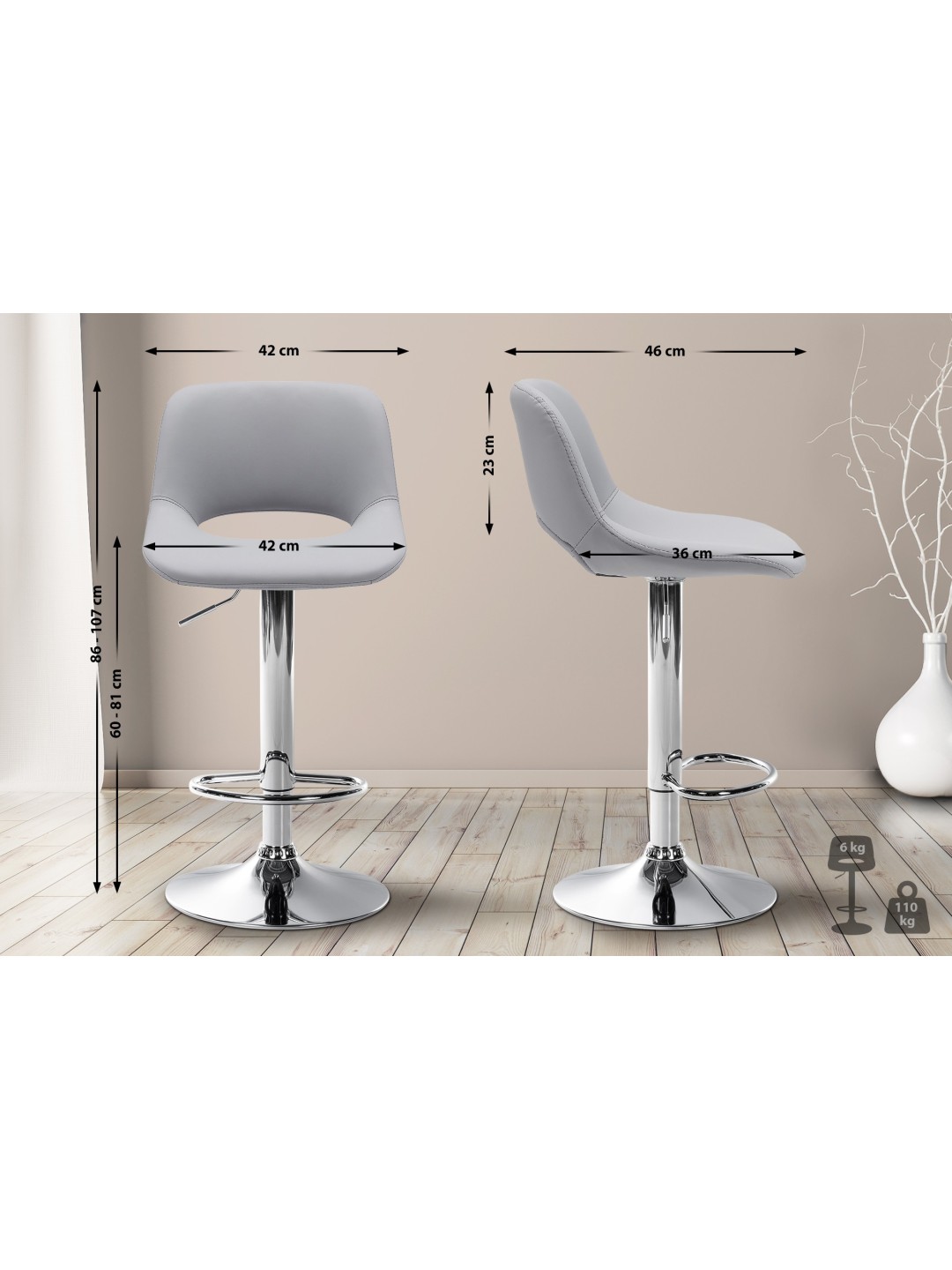 Den integrerede fodstøtte giver ekstra siddekomfort. Endelig er barstolen forsynet med gulvbeskyttere, så selv følsomme overflader beskyttes.