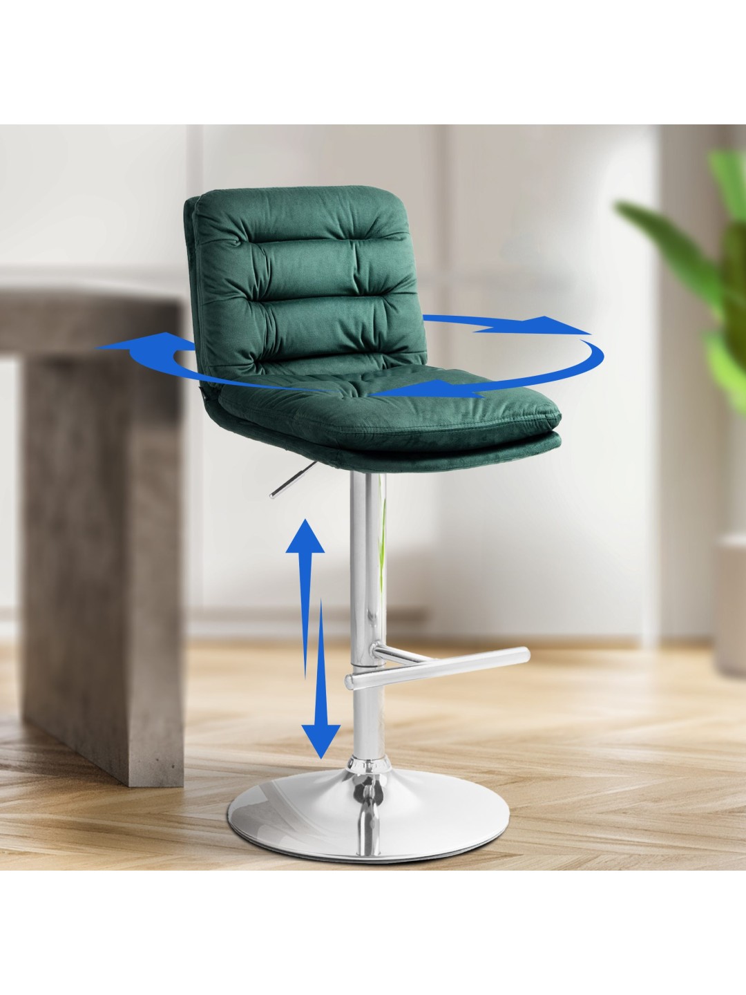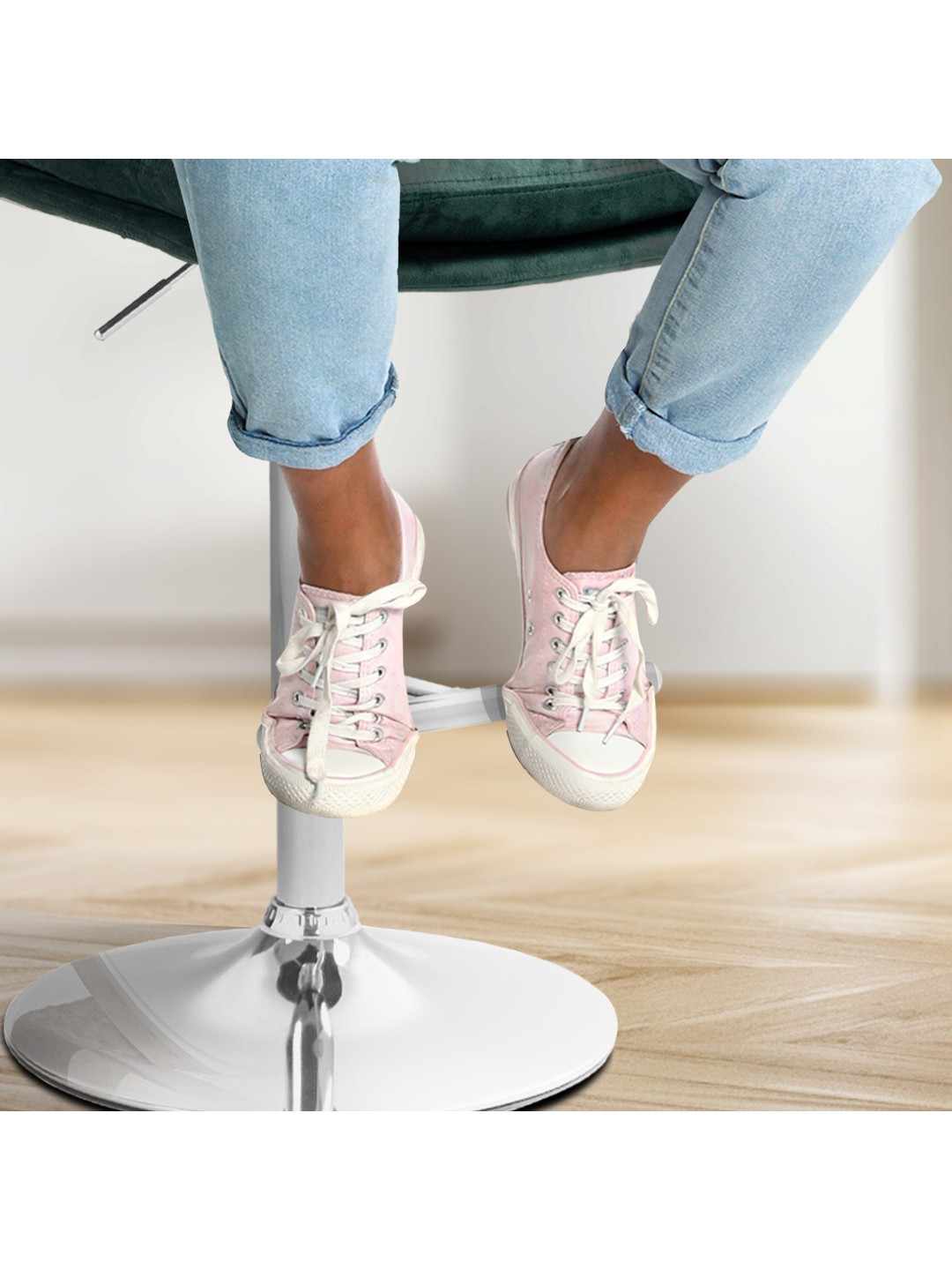 Skamlens stel og det moderigtige betræk giver taburetten et elegant udseende. Sædet er beklædt med stilfuldt fløjl. Metalrammen er højdejusterbar og 360 graders rotationsfunktionen sikrer masser af bevægelsesfrihed.