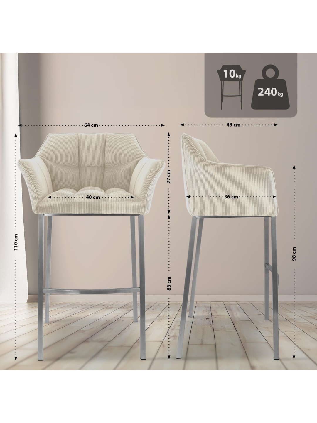 Barstol Damaso E Cord med 4 fods stel, creme