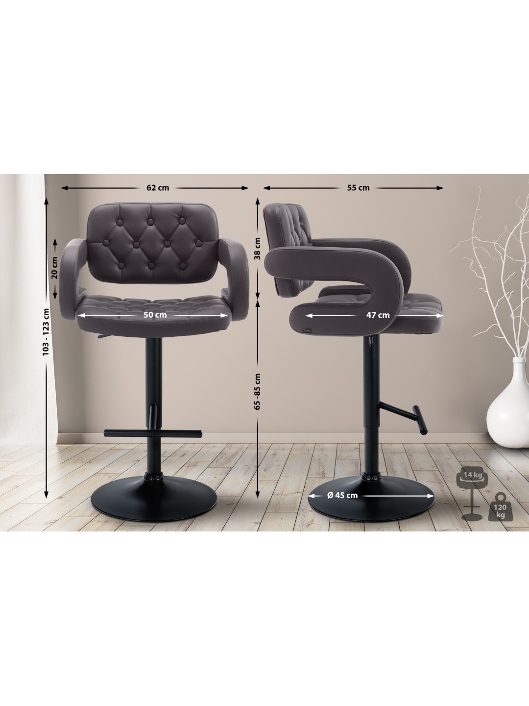 Barstolen er trinløst højdejusterbar, så sædehøjden kan justeres mellem 65 og 85 cm. Det betyder, at skamlen kan bruges på mange forskellige måder i forskellige bord- eller bordhøjder.