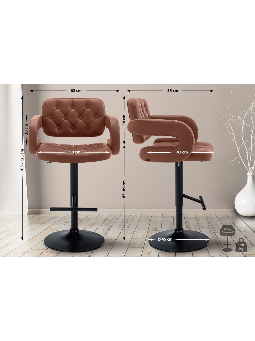 Barstolen er trinløst højdejusterbar, så sædehøjden kan justeres mellem 65 og 85 cm. Det betyder, at skamlen kan bruges på mange forskellige måder i forskellige bord- eller bordhøjder.