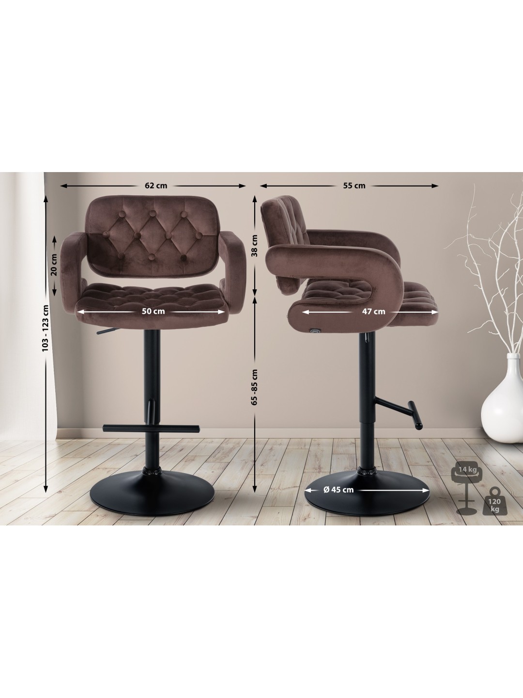 Barstolen er trinløst højdejusterbar, så sædehøjden kan justeres mellem 65 og 85 cm. Det betyder, at skamlen kan bruges på mange forskellige måder i forskellige bord- eller bordhøjder.