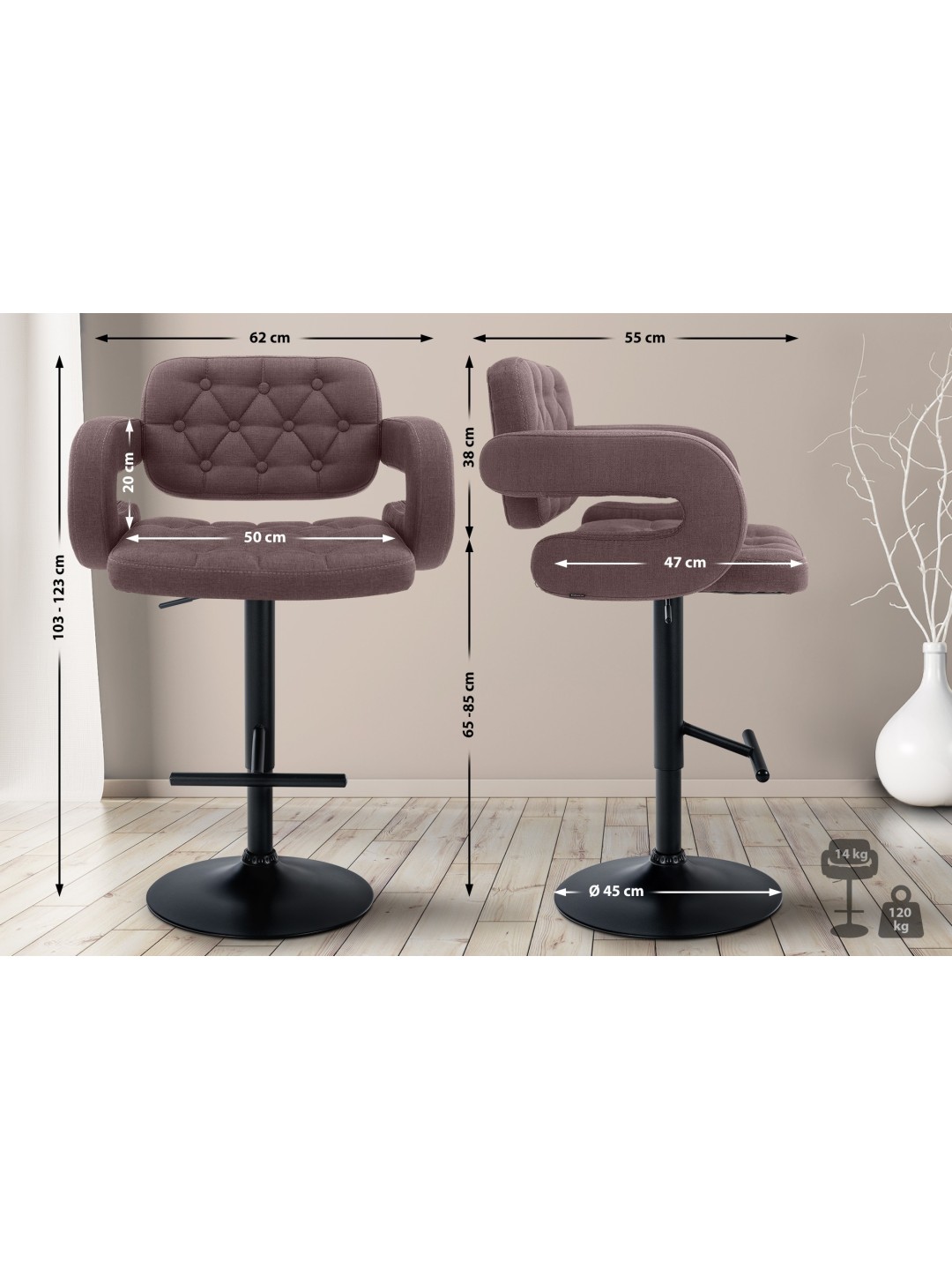 Barstolen er trinløst højdejusterbar, så sædehøjden kan justeres mellem 65 og 85 cm. Det betyder, at skamlen kan bruges på mange forskellige måder i forskellige bord- eller bordhøjder.