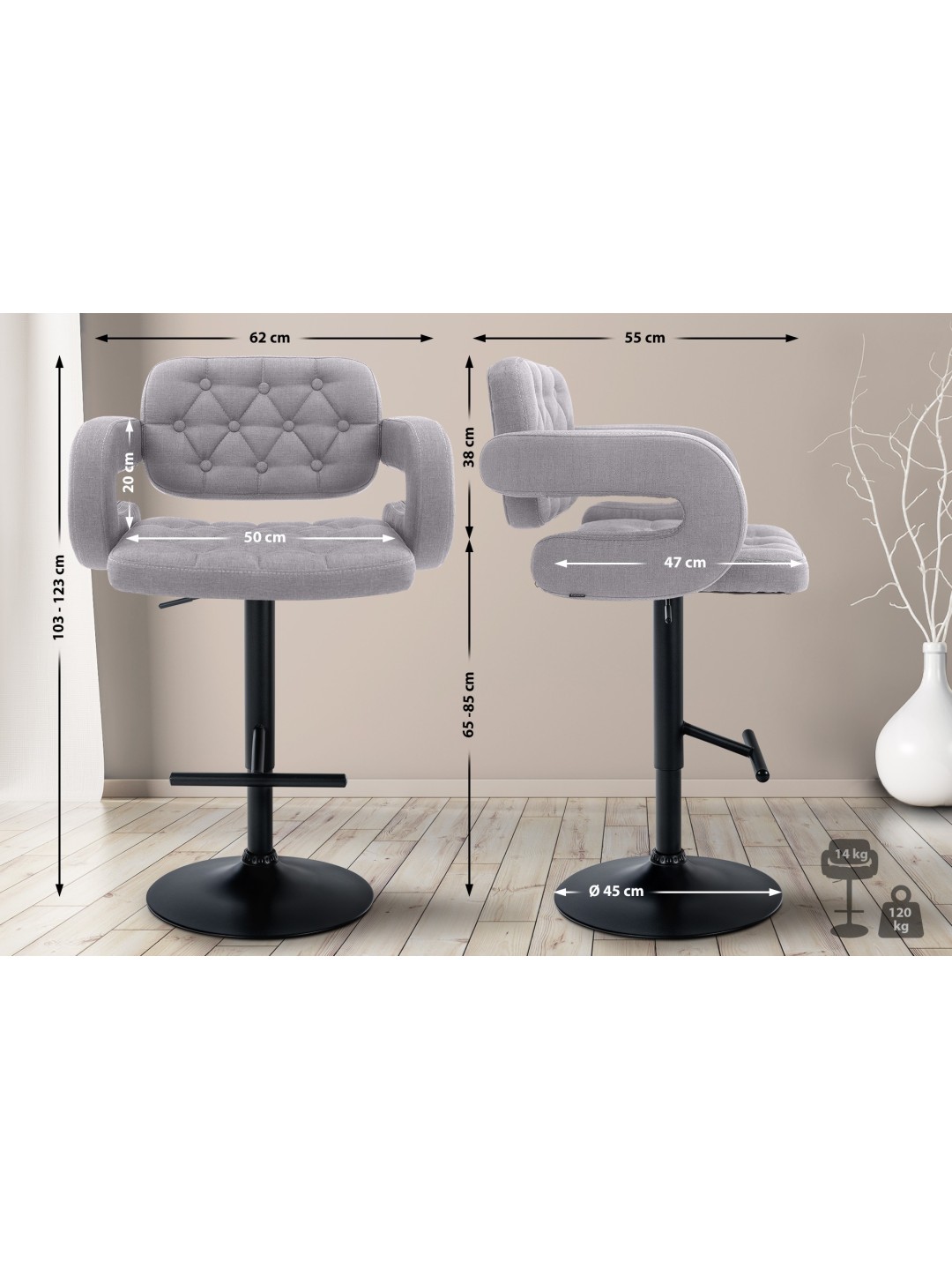 Barstolen er trinløst højdejusterbar, så sædehøjden kan justeres mellem 65 og 85 cm. Det betyder, at skamlen kan bruges på mange forskellige måder i forskellige bord- eller bordhøjder.