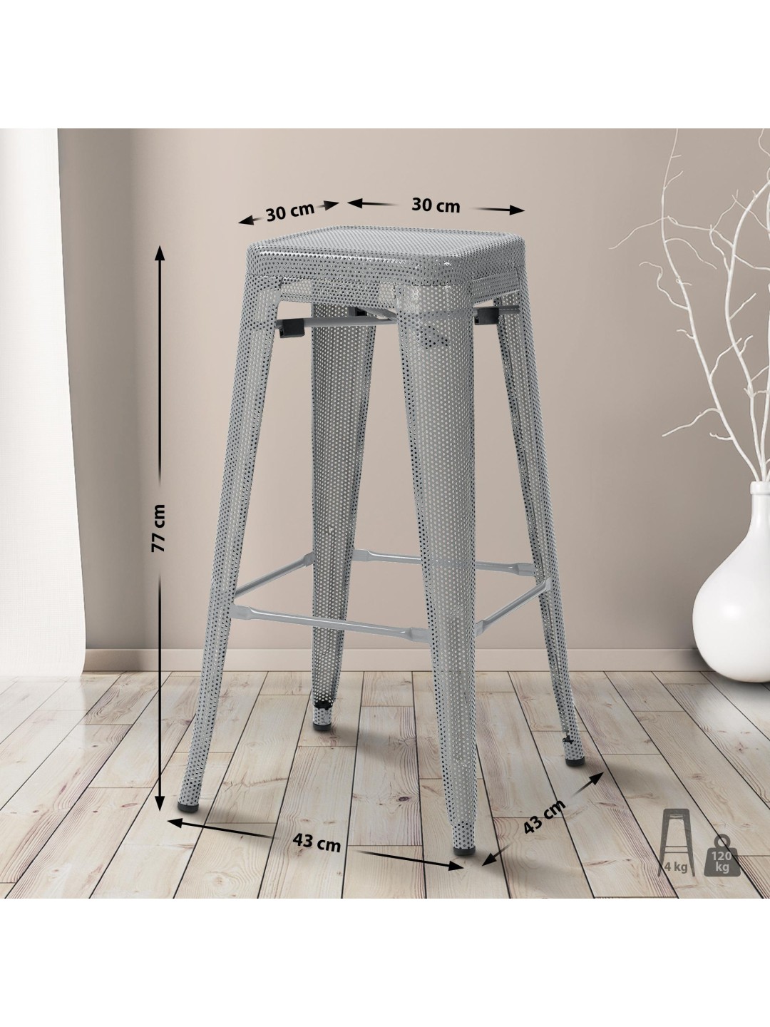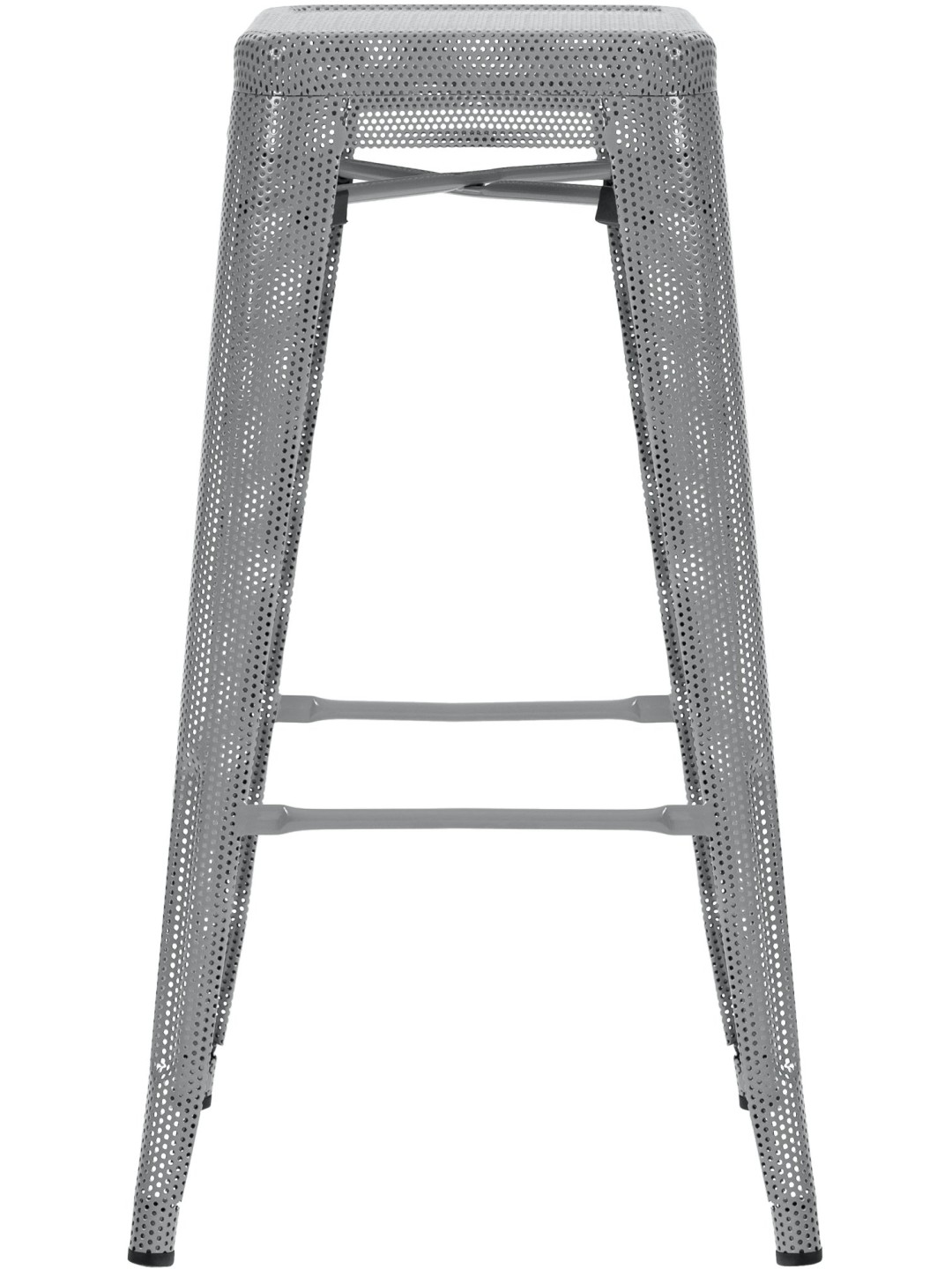 Udstyret med en perforeret metalramme kombinerer denne skammel visuel lethed med stabilitet og understøtter en bæreevne på op til 120 kg. Den har også en fodstøtte for forbedret siddekomfort. Den er stabelbar og er derfor særdeles velegnet til steder med begrænset plads. Sædehøjden er 77 cm, hvilket betyder, at den passer under enhver bar og et højt bord. Gulvbeskyttere medfølger for at beskytte gulve mod ridser og sikre stabilitet. Taburettens materiale er let at vedligeholde, hvilket gør den til et praktisk møbel til hverdagsbrug, både i hjemmet og i cateringsektoren. Dets industrielle design passer ind i moderne indretningsstile.
