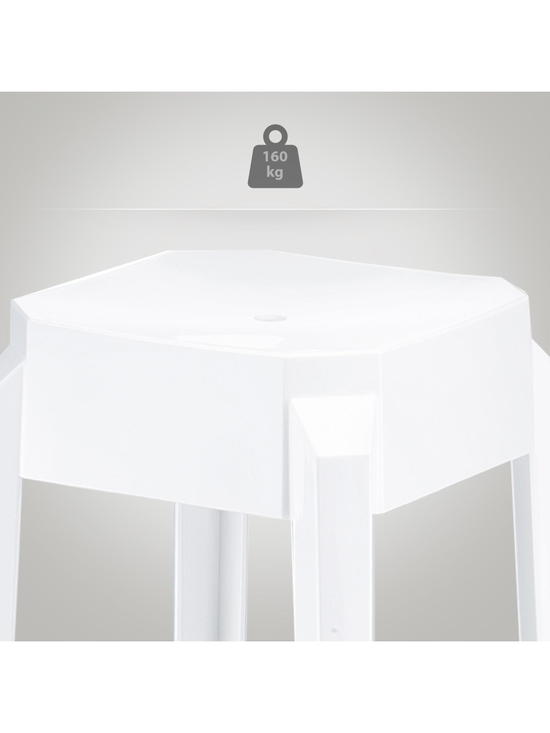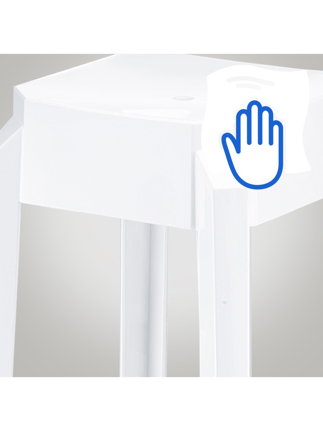 Med en sædehøjde på 75 cm og en omgivende fodstøtte giver den særlig komfort. Bordskamlen er stabelbar, så den kan opbevares for at spare plads. Skamlen er lavet af enten højkvalitets, skinnende nylon eller klar, gennemsigtig polycarbonat.