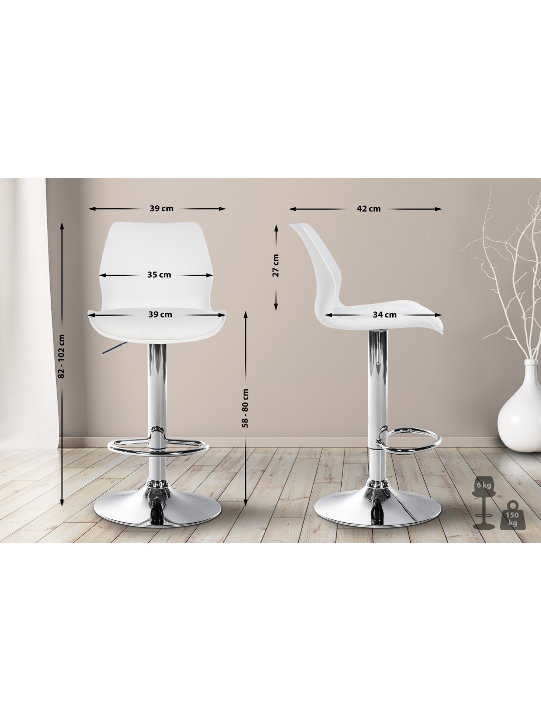 Barstolen Gilbert kombinerer moderne design med funktionel komfort. Sædet lavet af slidstærkt plastik og betrækket lavet af højkvalitets kunstlæder gør det til en langtidsholdbar ledsager i ethvert køkken, bar eller spisestue. Takket være højdejusteringen og 360° rotationsfunktionen kan taburetten let tilpasses enhver situation. Den solide trompetbase sikrer stabilitet, mens den integrerede fodstøtte giver en ekstra komfortfaktor.