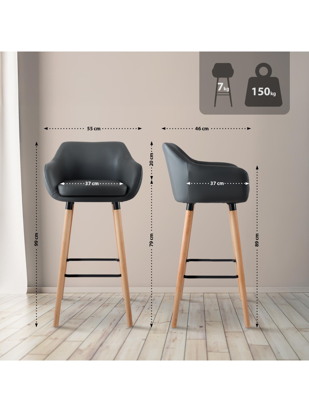 Det firbenede stel af kraftigt bøgetræ sørger for, at stolen står sikkert og kan holde op til 150 kilo. Takket være gulvbeskytterne under stolebenene bliver følsomme gulve ikke beskadiget.
