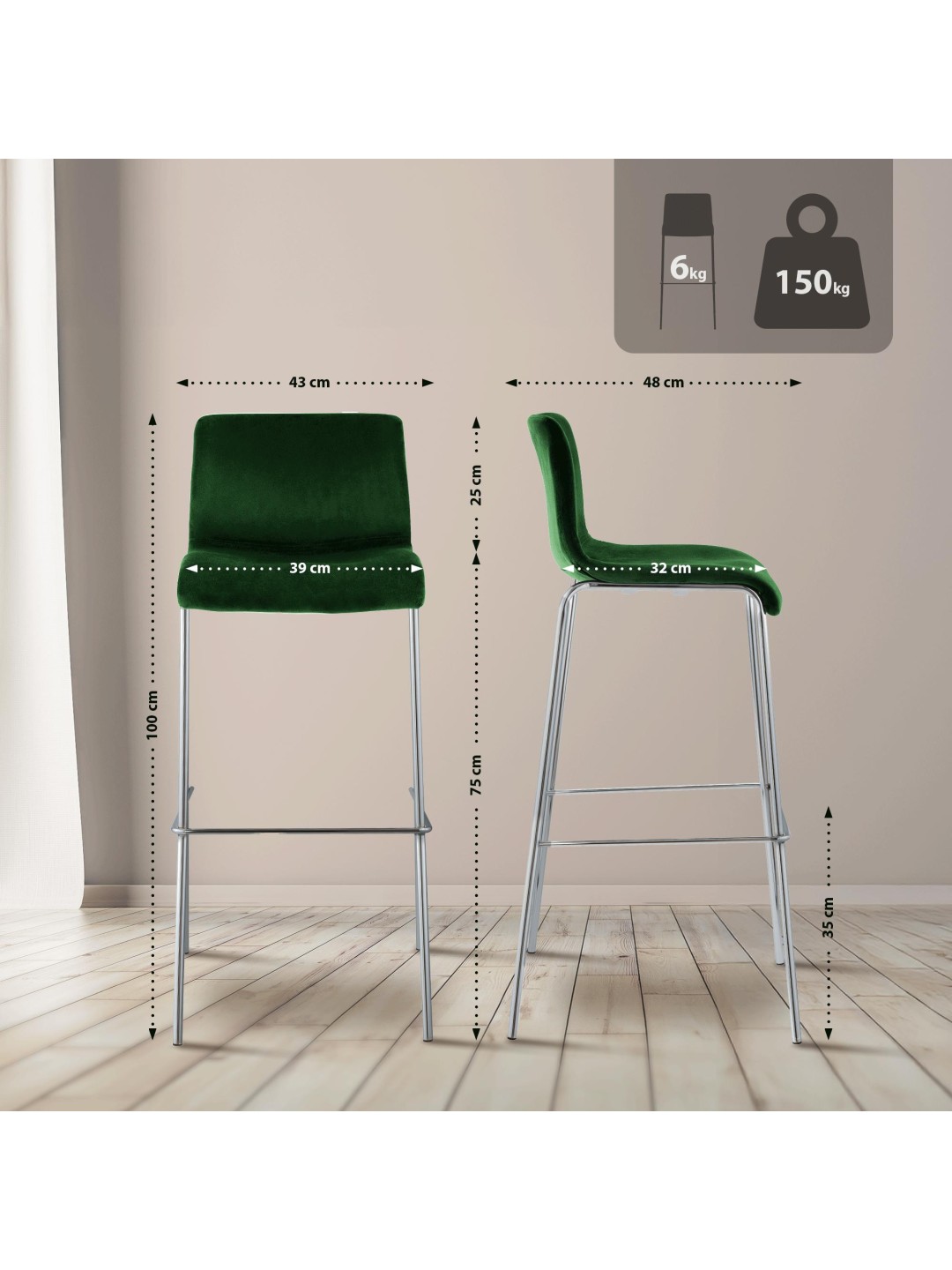 Barstol Hoover fløjl 4-fods krom, grøn