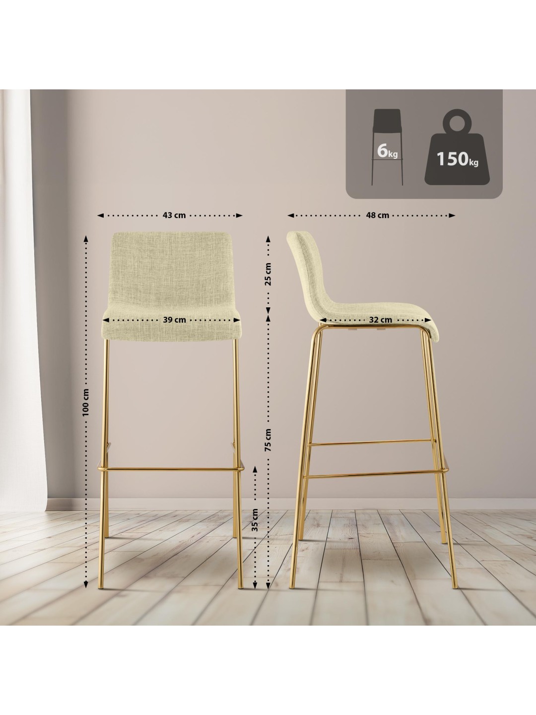Barstol Hover stof firbenet stel guld look