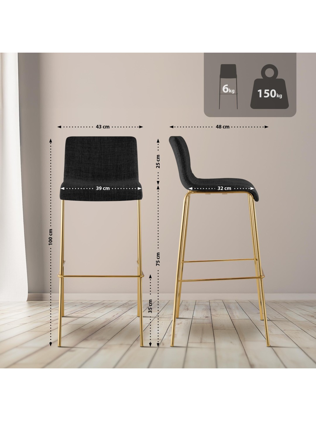 Barstol Hover stof firbenet stel guld look