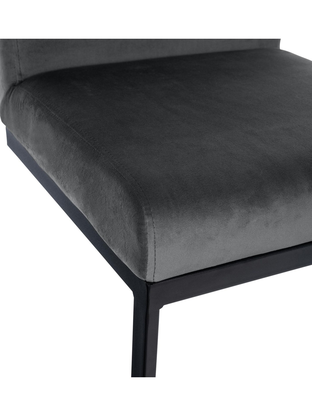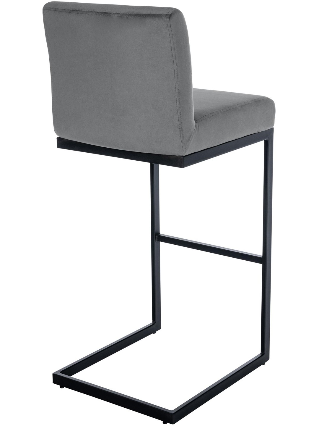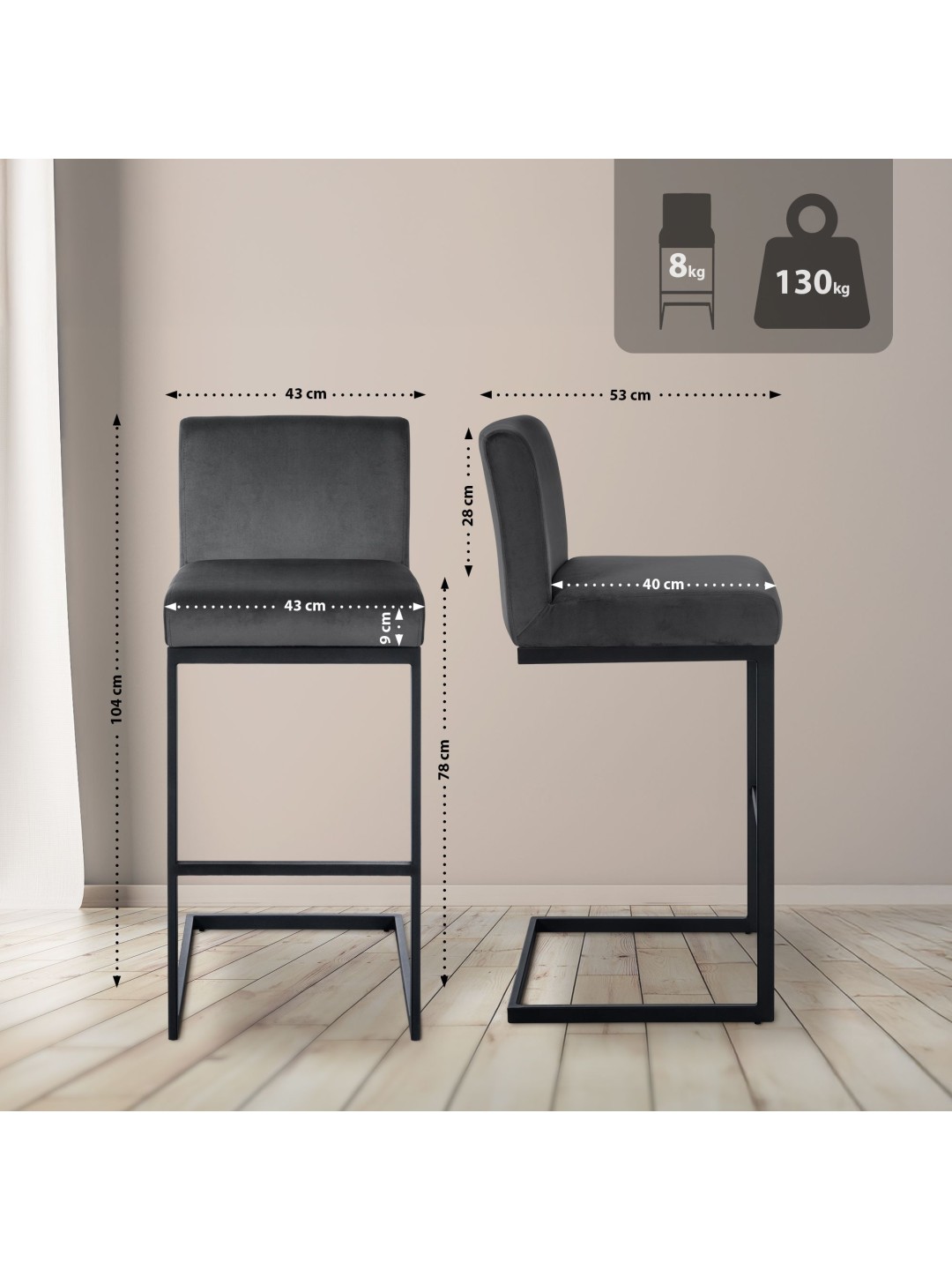 Den lige udkragede stel af pulverlakeret metal skaber et fantastisk blikfang, og den lille gyngen i sædet opfattes som meget behagelig. En integreret tværstang fungerer som en behagelig fodstøtte, mens ryglænet på sædet understøtter det nederste rygområde. Sæde og ryglæn er generøst polstret og har et stilfuldt fløjlsbetræk.