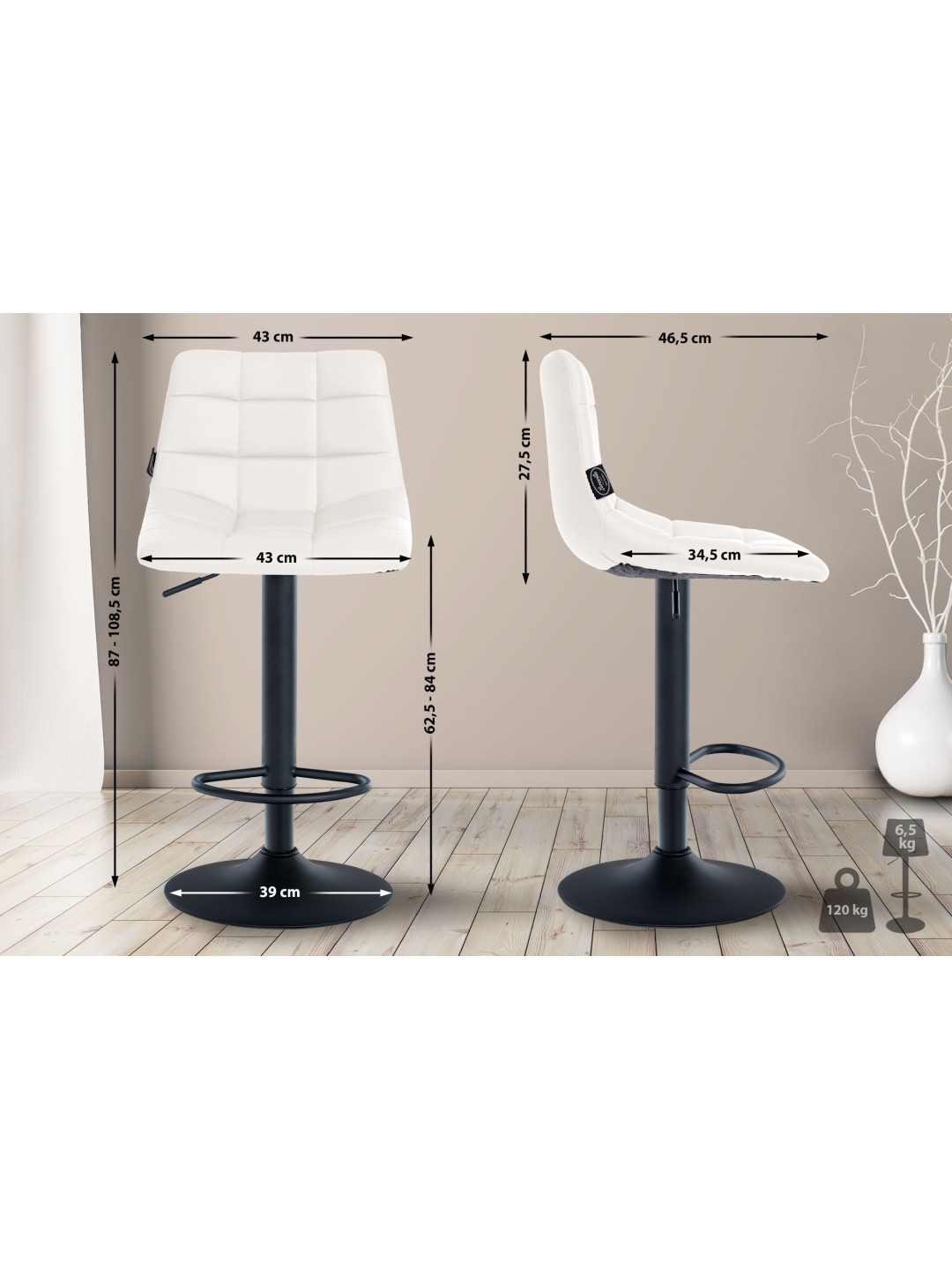 Taburettens betrækket er lavet af blødt imiteret læder og har et klassisk quiltet mønster. Barstolens elegante og tidløse look understreges af betræk i imiteret læder i forskellige farver. Taburettens robuste metalramme fås i krom eller sort og sikrer høj stabilitet og lang levetid. Taburettens minimalistiske og moderne design passer problemfrit ind i ethvert interiør.