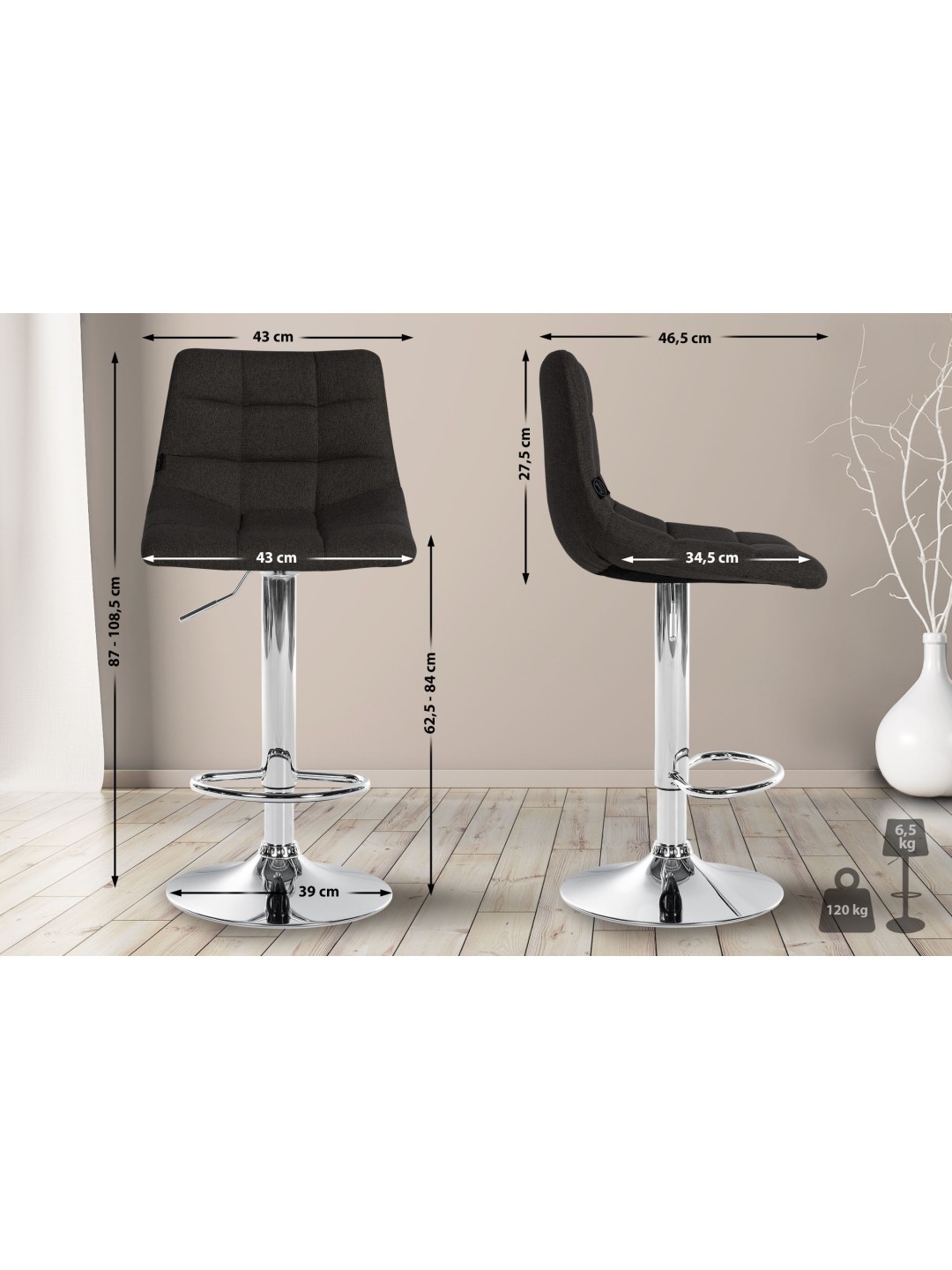 Taburettens betrækket er lavet af blødt stof og har et klassisk quiltet mønster. Barstolens elegante og tidløse look understreges af stofbetræk i forskellige farver. Taburettens robuste metalramme fås i krom eller sort og sikrer høj stabilitet og lang levetid. Taburettens minimalistiske og moderne design passer problemfrit ind i ethvert interiør.