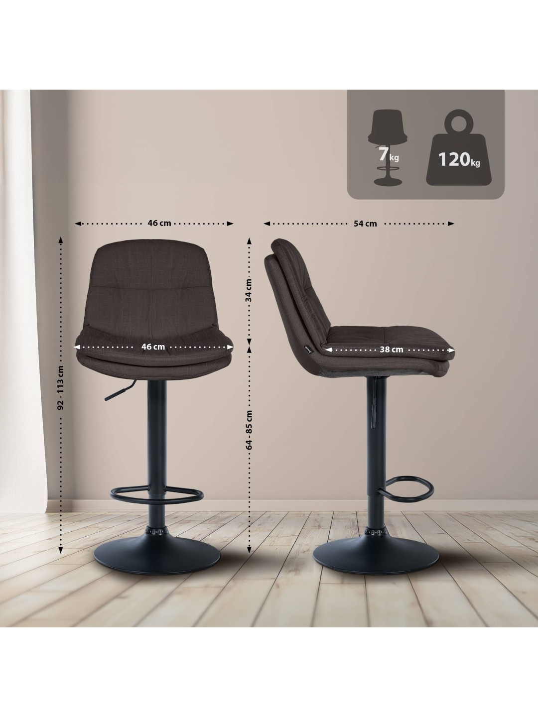 Sædeareal (B x D): 46 cm x 38 cm ryglænet: 38 ma. Belastningsevne: 120 kg
