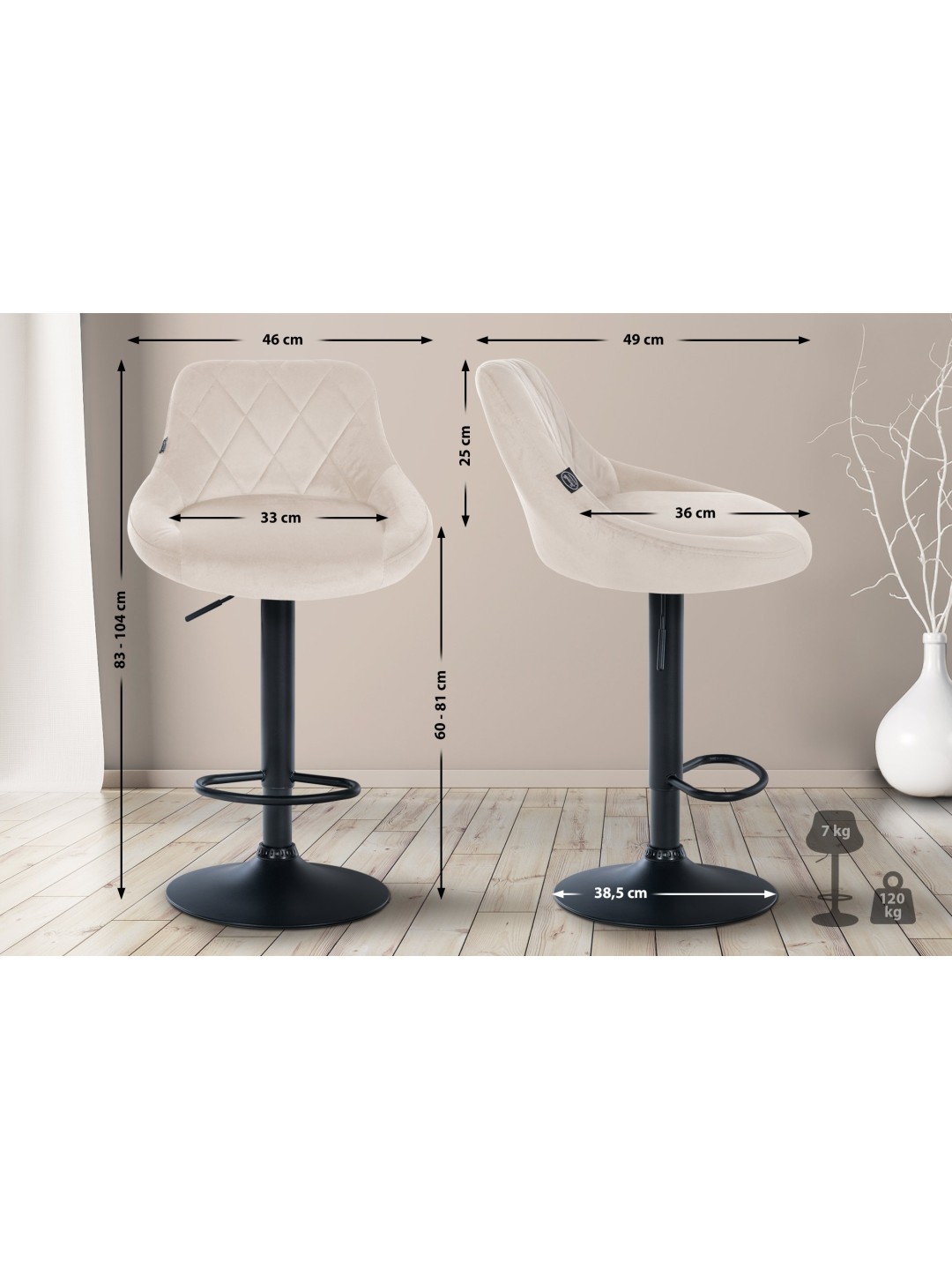 Denne stol imponerer med sit stilfulde design. Sædet er betrukket med fløjlsstof og har kunstfærdige dekorative syninger. Ved hjælp af gasliften kan denne model justeres trinløst til den ønskede højde, hvilket gør den ideel til enhver diskhøjde. Fodstøtten, der sikrer en fremragende siddekomfort, kan justeres synkront med sædets højde. Sædet kan drejes 360° med fodstøtten. Stellet er lavet af metal, der er gulvbeskyttere under trompetbunden, der forhindrer, at gulvet bliver ridset.