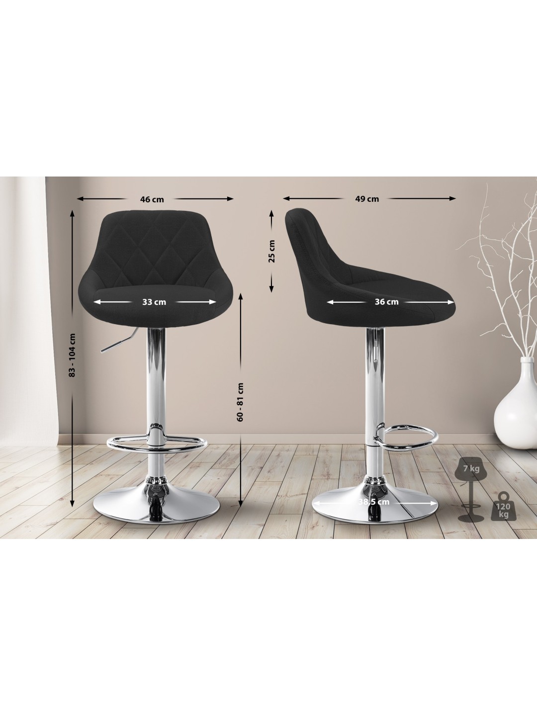 Denne stol imponerer med sit stilfulde design. Sædet er betrukket med stof og har kunstfærdige dekorative syninger. Ved hjælp af gasliften kan denne model justeres trinløst til den ønskede højde, hvilket gør den ideel til enhver diskhøjde. Fodstøtten, der sikrer en rigtig god siddekomfort, kan justeres synkront med sædets højde. Sædet kan drejes 360° med fodstøtten. Stellet er lavet af metal, der er gulvbeskyttere under trompetbunden, der forhindrer, at gulvet bliver ridset.