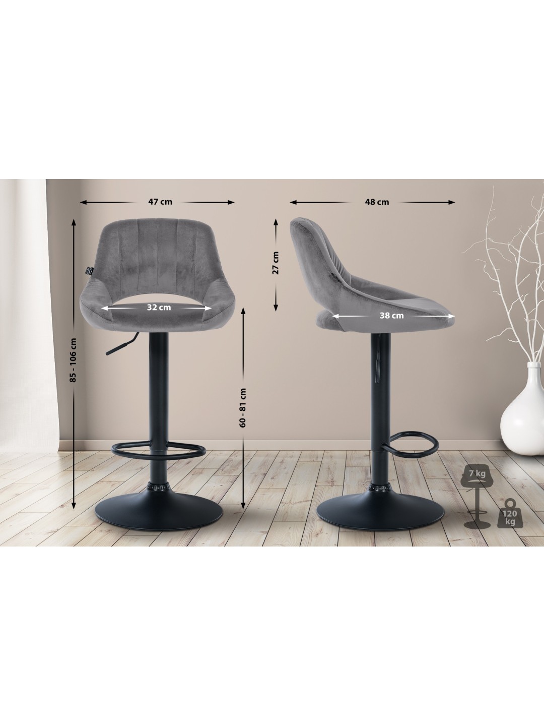 Barstol Milet fløjl, mørkegrå