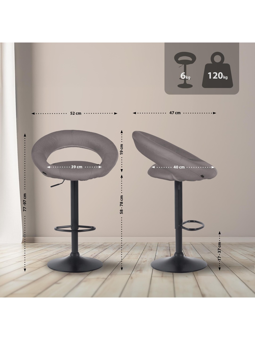 Barstolen er trinløst højdejusterbar, så sædehøjden kan justeres mellem 58 og 78 cm. Det betyder, at taburetten kan bruges på mange forskellige måder i forskellige bord- eller bordhøjder.