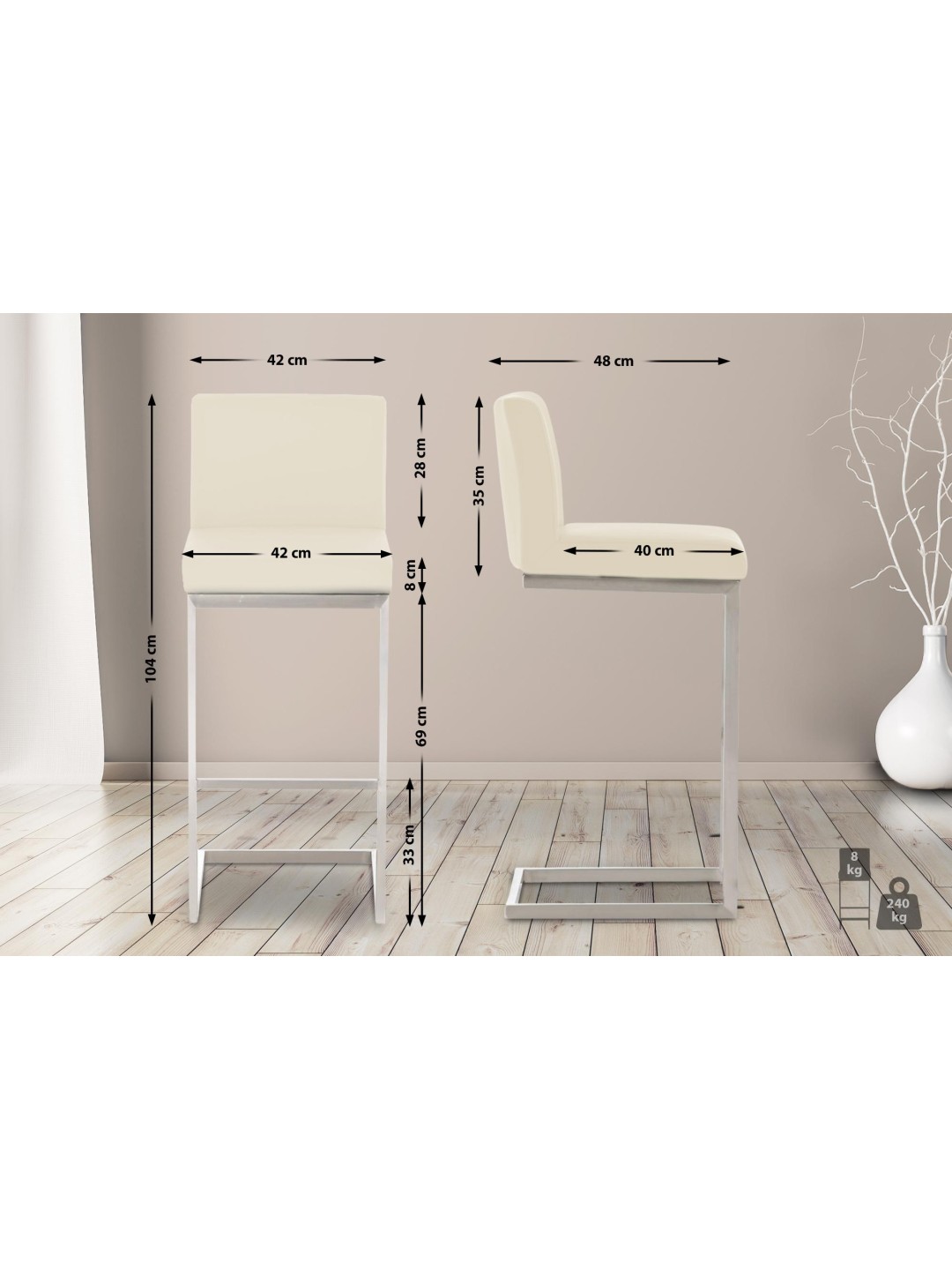Barstolen kan sikkert belastes med op til 240 kilo. Udstyret med gulvbeskyttere beskytter Paros barstolen ikke kun gulvet, men tilbyder også et sikkert stativ.