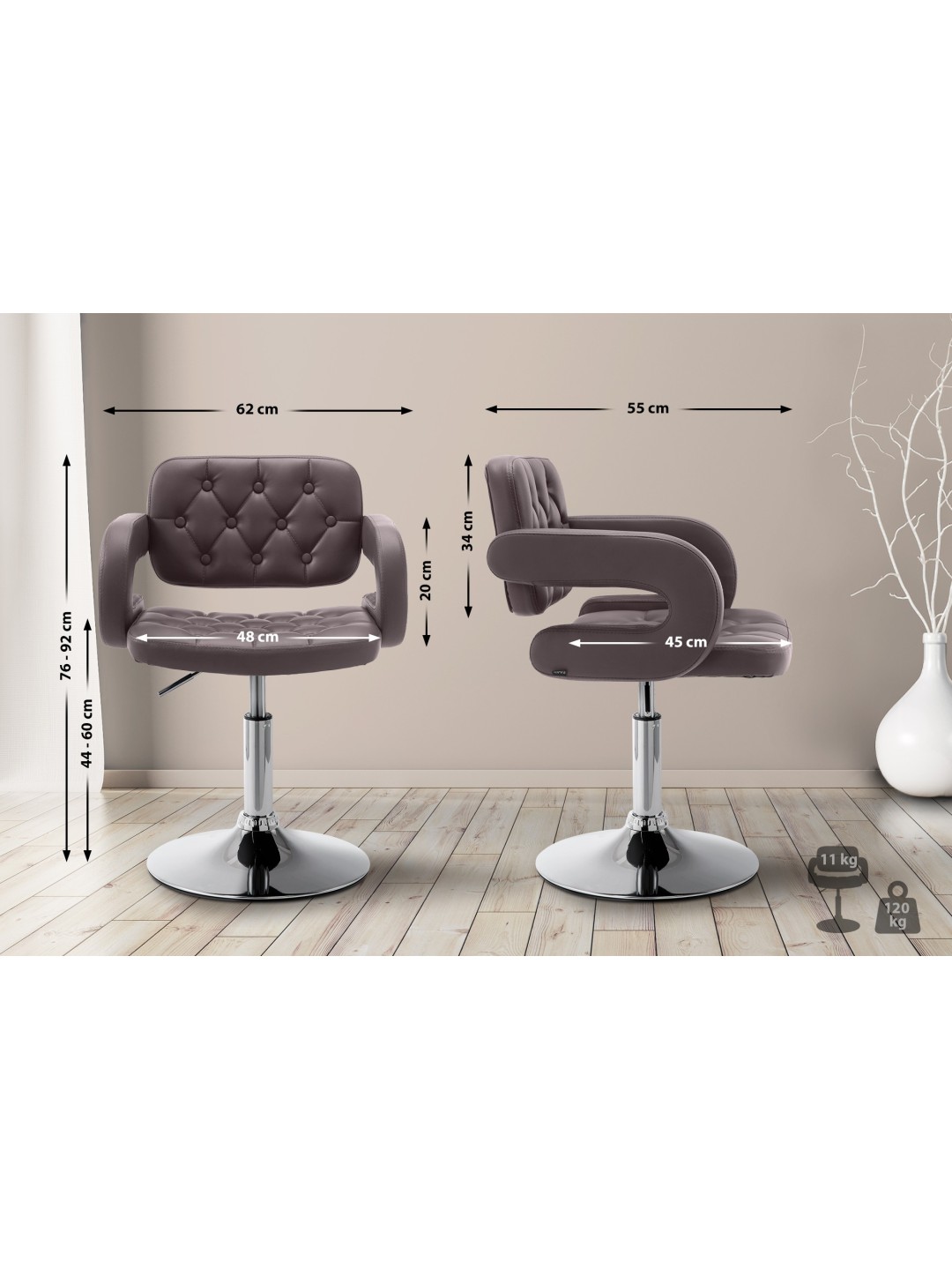 Den polstrede stol er trinløst højdejusterbar, så sædehøjden kan justeres mellem 44 og 60 cm. Det betyder, at stolen kan bruges til forskellige bordhøjder og kropsstørrelser.