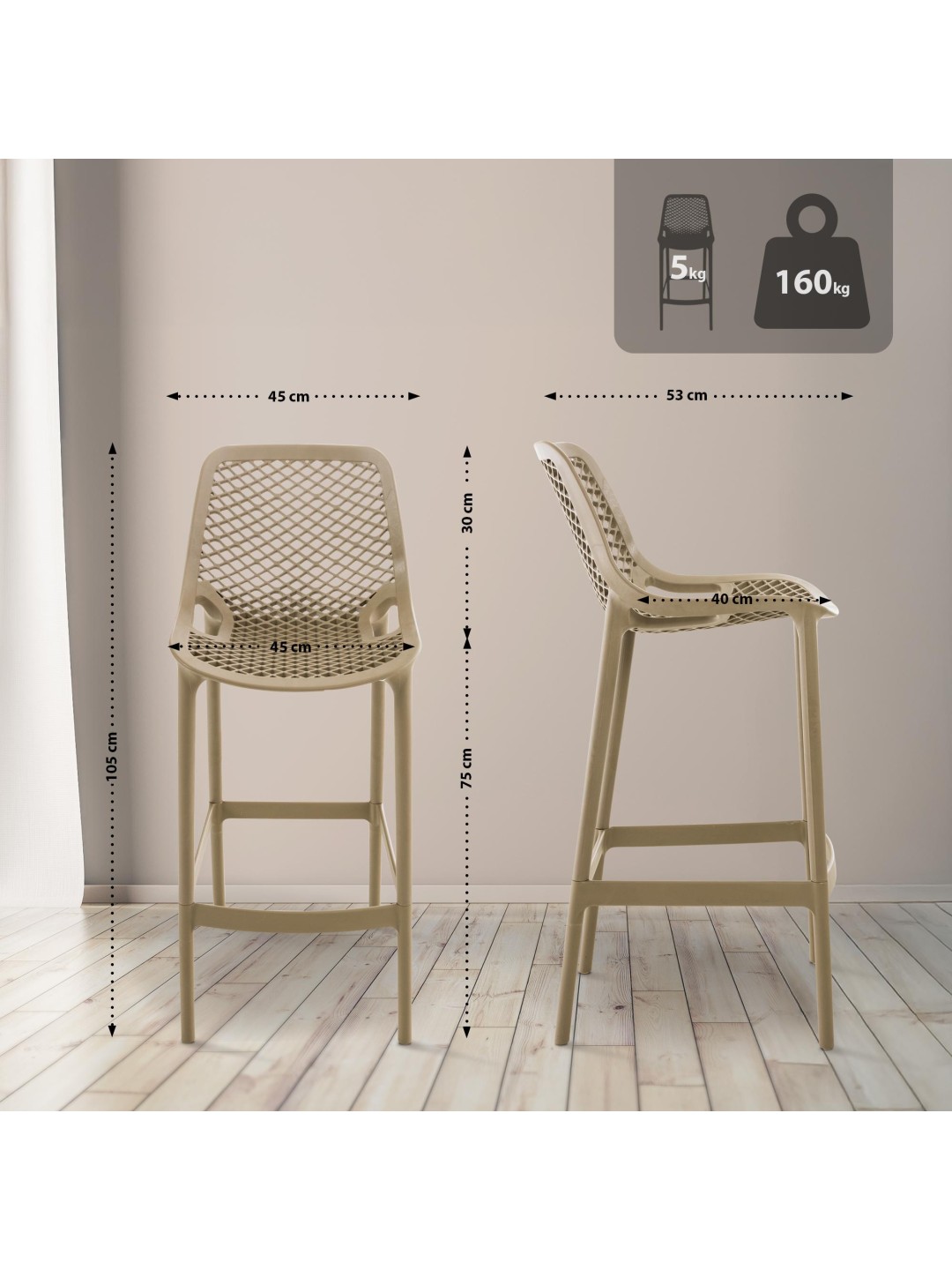 Barstolen Air er lavet af UV-bestandig polypropylen af ​​høj kvalitet og imponerer med sin vejrbestandighed. Det betyder, at stolene ikke kun kan bruges indendørs, men også udendørs. Stolene er derfor også et godt valg som havestole, til terrassen eller altanen.