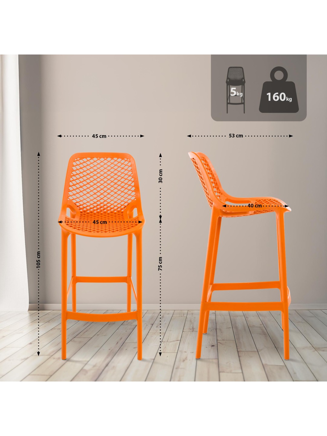 Barstolen Air er lavet af UV-bestandig polypropylen af høj kvalitet og imponerer med sin vejrbestandighed. Det betyder, at stolene ikke kun kan bruges indendørs, men også udendørs. Stolene er derfor også et godt valg som havestole, til terrassen eller altanen.