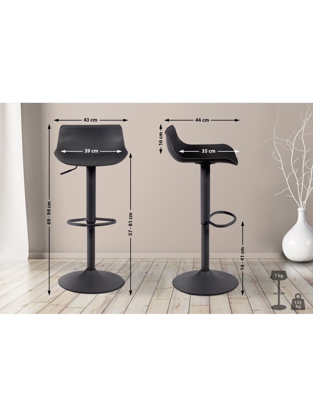 Aveiro barstole består af en buet plastik sædeskal, der giver behagelig siddekomfort. Bordskamlen kan højdejusteres ved hjælp af en gaslift, og sædet kan drejes 360°, så det kan justeres til enhver ønsket siddeposition.