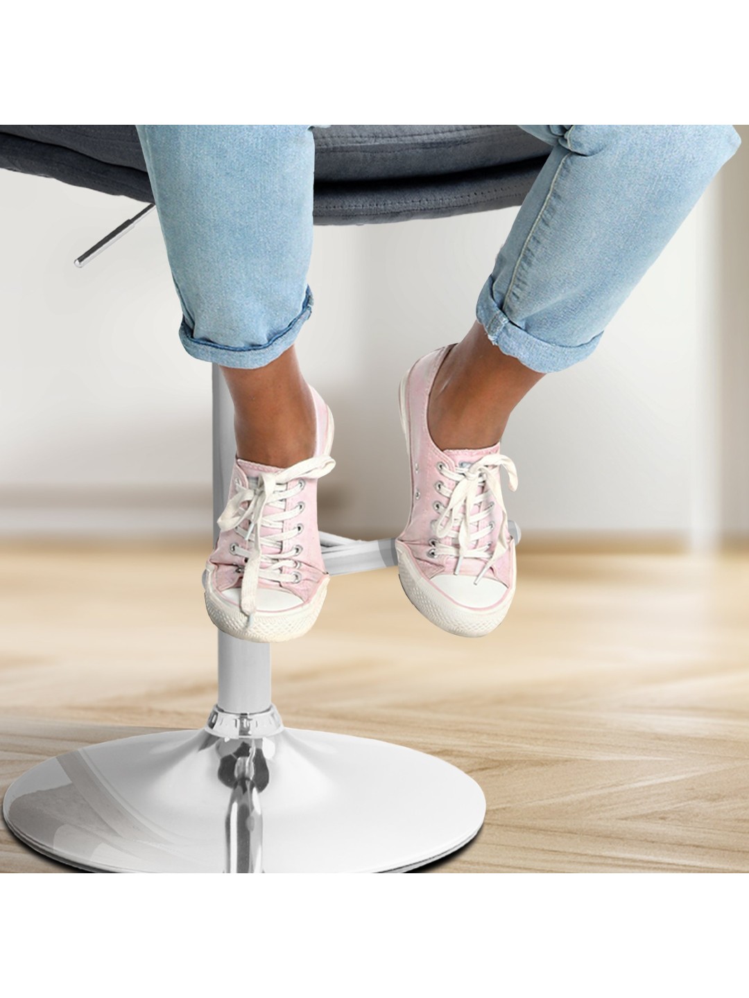 Skamlens stel og det moderigtige betræk giver taburetten et elegant udseende. Sædet er beklædt med stilfuldt fløjl. Metalrammen er højdejusterbar og 360 graders rotationsfunktionen sikrer masser af bevægelsesfrihed.