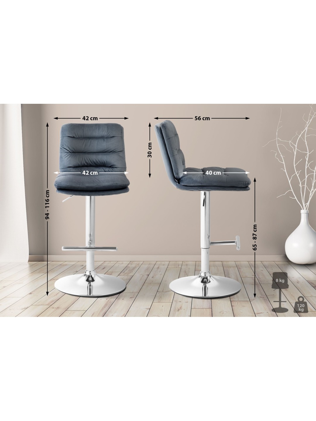 Siddeområde (B x D): 42 x 40 cm. Belastningsevne: 120 kg