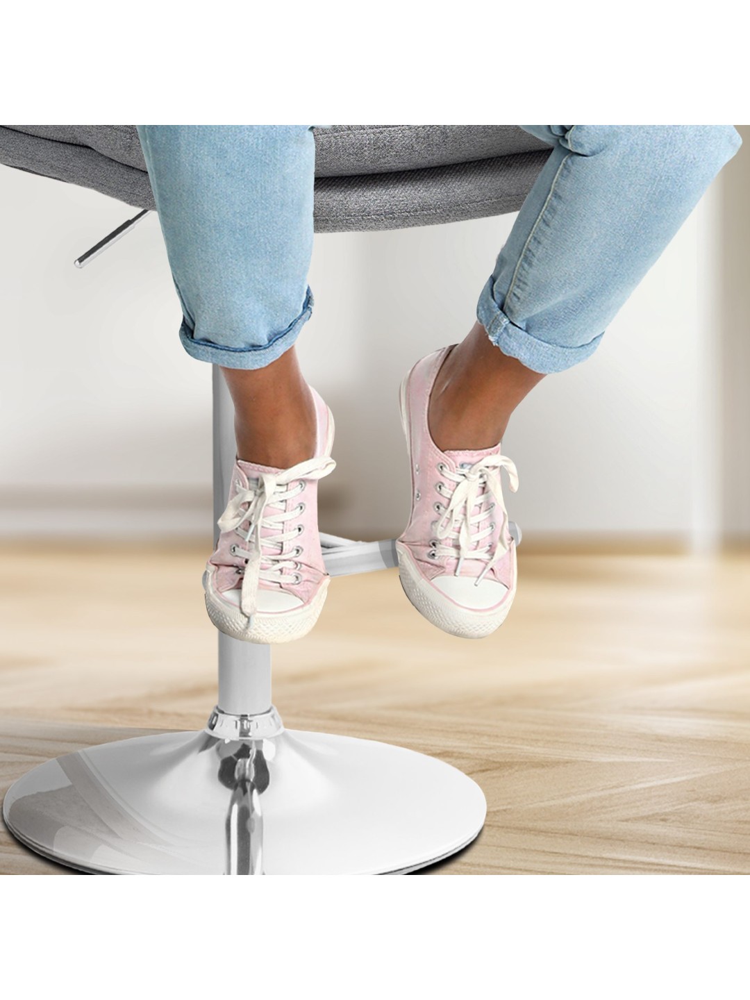 Skamlens stel og det moderigtige betræk giver taburetten et elegant udseende. Sædet er beklædt med et slidstærkt stofbetræk. Metalrammen er højdejusterbar og 360 graders rotationsfunktionen sikrer masser af bevægelsesfrihed.