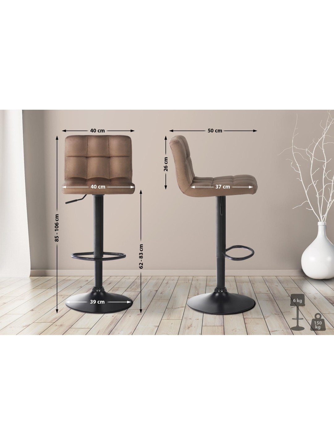 Dette bordstolsæt blander moderne design og hygge til en vellykket aften. Dens sæder er behageligt polstret og har et fint fløjlsbetræk. Køkkentabletterne kan justeres i højden og tilpasses derfor enhver kropsstørrelse. En trompetbund lavet af mat sort metal giver hver barstol et stabilt hold. Dens stel er desuden udstyret med en stilfuld fodstøtte, som sikrer endnu mere komfort. Det moderne barstolssæt præsenterer sig i godt humør i blå, grå, grøn, pink, sort, brun, rød, pink og gul.