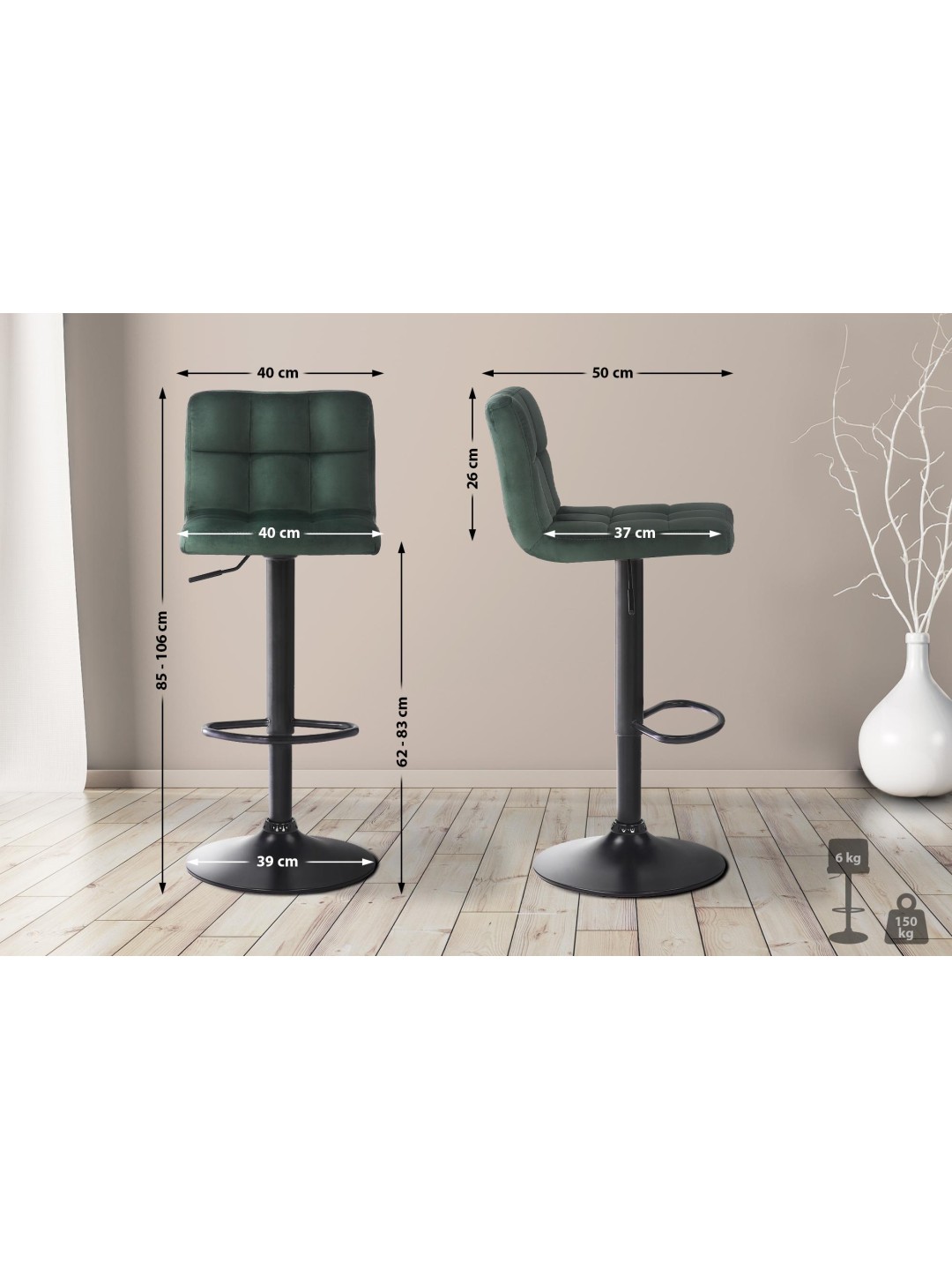 Dette bordstolsæt blander moderne design og hygge til en vellykket aften. Dens sæder er behageligt polstret og har et fint fløjlsbetræk. Køkkentabletterne kan justeres i højden og tilpasses derfor enhver kropsstørrelse. En trompetbund lavet af mat sort metal giver hver barstol et stabilt hold. Dens stel er desuden udstyret med en stilfuld fodstøtte, som sikrer endnu mere komfort. Det moderne barstolssæt præsenterer sig i godt humør i blå, grå, grøn, pink, sort, brun, rød, pink og gul.