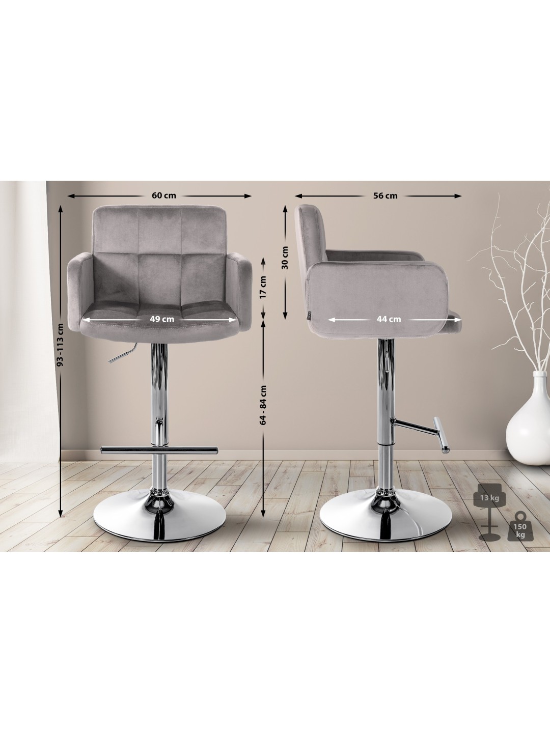 Taburetterne skylder deres smukke udseende til den stilfulde kombination af elegant fløjlsbetræk og metalstel i forskellige farver.