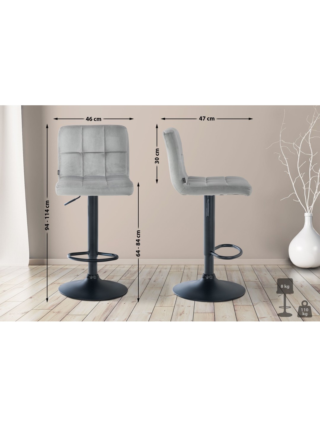 Sættet med 2 Peru Velvet barstole tilbyder en funktionel og stilfuld siddeløsning til køkken- og barområder. Barstolens højdejusterbarhed og 360 graders drejefunktion giver mulighed for fleksibel tilpasning til forskellige miljøer og behov. Det quiltede fløjlsbetræk og det robuste metalstel sikrer langvarig brug og nem pleje. Taburettens trompetfødder har indbyggede fodstøtter for ekstra komfort, mens gulvbeskyttere beskytter gulve mod slitage. Sættet er nemt at samle, hvilket muliggør hurtig og ukompliceret idriftsættelse.
