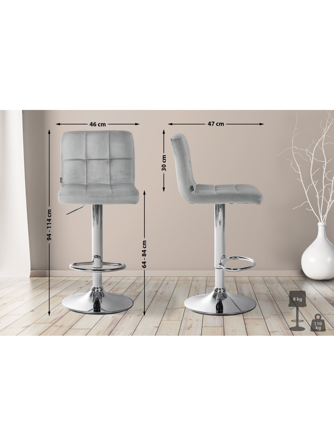 Sættet med 2 Peru Velvet barstole tilbyder en funktionel og stilfuld siddeløsning til køkken- og barområder. Barstolens højdejusterbarhed og 360 graders drejefunktion giver mulighed for fleksibel tilpasning til forskellige miljøer og behov. Det quiltede fløjlsbetræk og det robuste metalstel sikrer langvarig brug og nem pleje. Taburettens trompetfødder har indbyggede fodstøtter for ekstra komfort, mens gulvbeskyttere beskytter gulve mod slitage. Sættet er nemt at samle, hvilket muliggør hurtig og ukompliceret idriftsættelse.