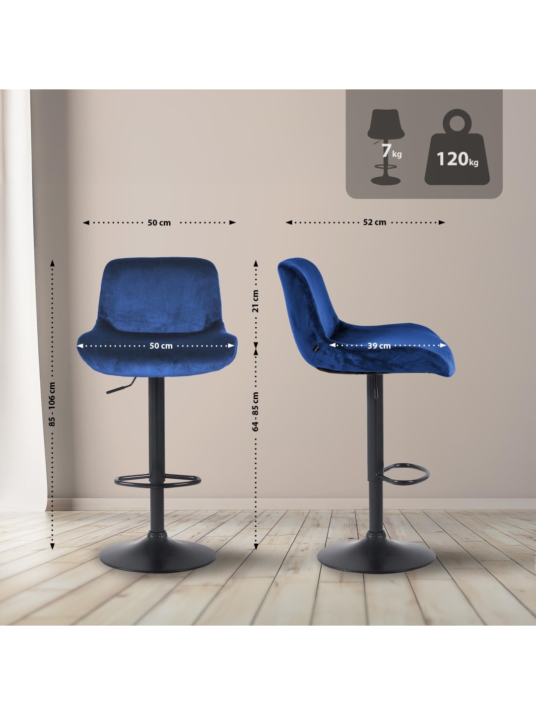 Det matsorte metalskammelstel og det moderigtige betræk giver taburetten et elegant udseende. Sædet er betrukket med enten slidstærkt stof eller stilfuldt fløjl. Metalrammen er højdejusterbar og 360 graders rotationsfunktionen sikrer masser af bevægelsesfrihed.