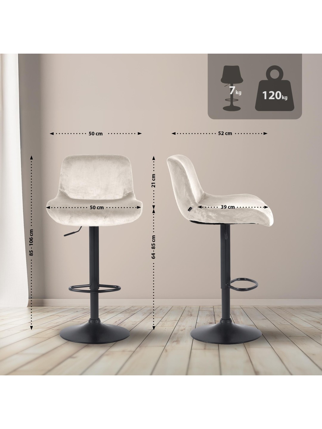 Det matsorte metalskammelstel og det moderigtige betræk giver taburetten et elegant udseende. Sædet er betrukket med enten slidstærkt stof eller stilfuldt fløjl. Metalrammen er højdejusterbar og 360 graders rotationsfunktionen sikrer masser af bevægelsesfrihed.