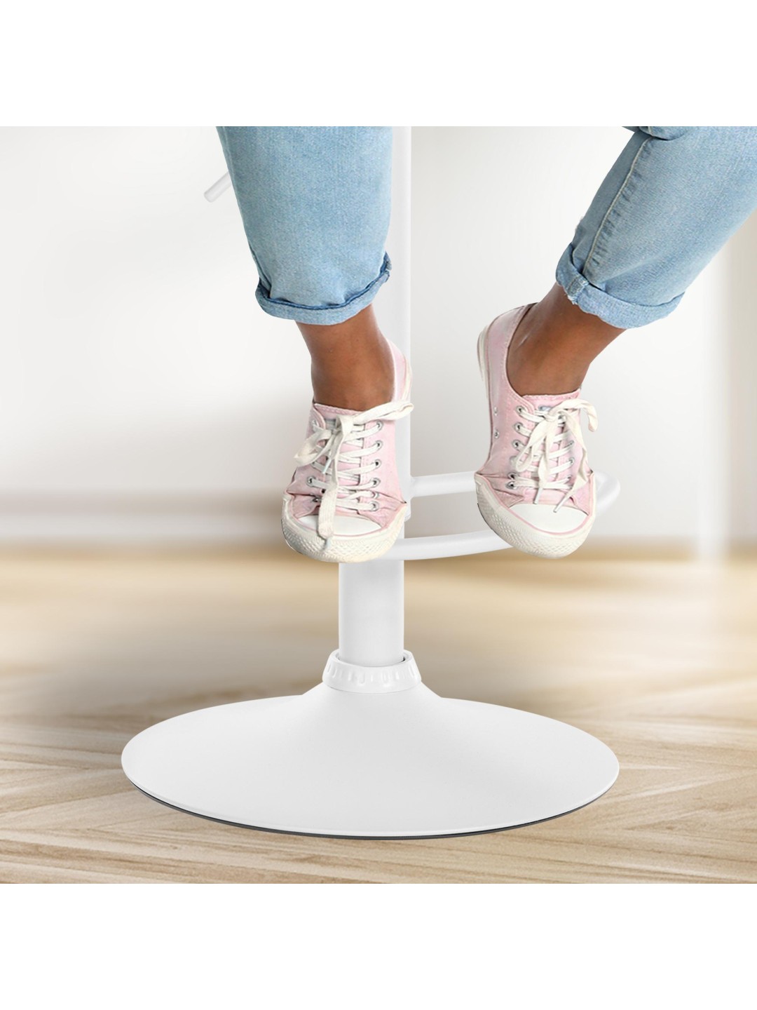 Den hvide metalskammel og det moderigtige betræk giver taburetten et elegant udseende. Sædet er betrukket med enten slidstærkt stof eller stilfuldt fløjl. Metalrammen er højdejusterbar og 360 graders rotationsfunktionen sikrer masser af bevægelsesfrihed.