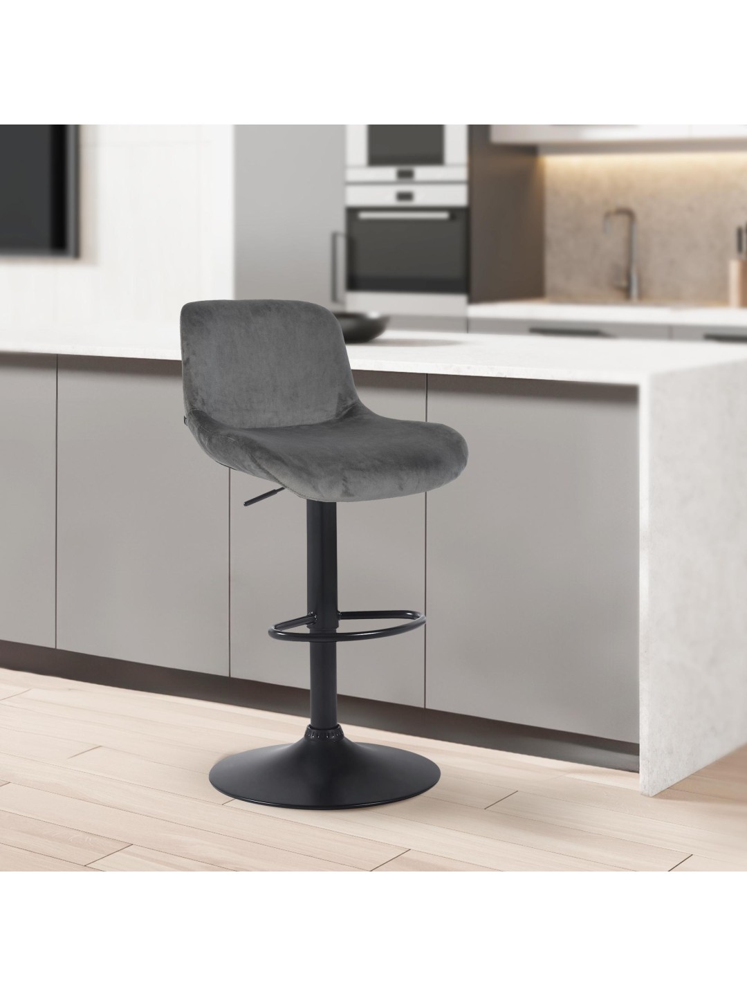Det matsorte metalskammelstel og det moderigtige betræk giver taburetten et elegant udseende. Sædet er betrukket med enten slidstærkt stof eller stilfuldt fløjl. Metalrammen er højdejusterbar og 360 graders rotationsfunktionen sikrer masser af bevægelsesfrihed.
