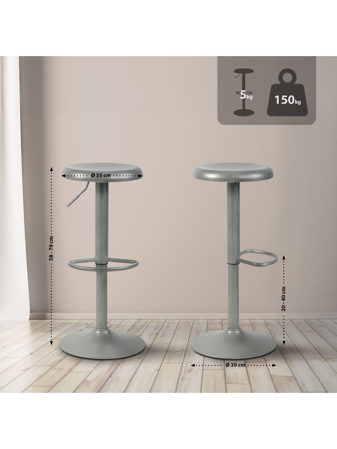 Den jævne højdejustering fra 58 cm til 78 cm og den komfortable fodstøtte garanterer høj siddekomfort, mens den drejelige mulighed giver maksimal fleksibilitet. Det elegante metalstel med gulvbeskyttere beskytter dit gulv og gør denne barstol robust og holdbar med en belastningskapacitet på op til 150 kg.