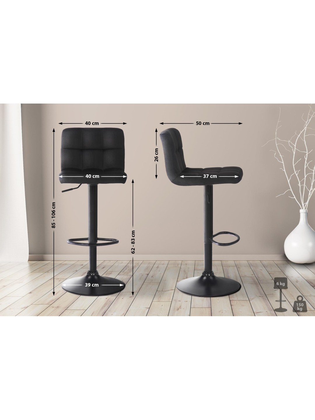 Disse moderne barstole er kendetegnet ved deres tidløst smarte design. De elegante sæder lover en fantastisk siddeoplevelse, da de polstrede ryglæn giver din ryg den støtte, du skal bruge for at sidde komfortabelt i timevis. Sæderne er beklædt med letplejet fløjl, og metalstellet med deres trompetfødder giver en meget høj stabilitet. Takket være de valgbare farver kan du finde de rigtige barstole til ethvert boligmiljø. De buede fodstøtter lader ikke dine fødder hænge. Bordskamlerne kan justeres trinløst i højden ved hjælp af en gaslift, og sæderne kan drejes 360°, hvilket gør dem ideelle til enhver disk.