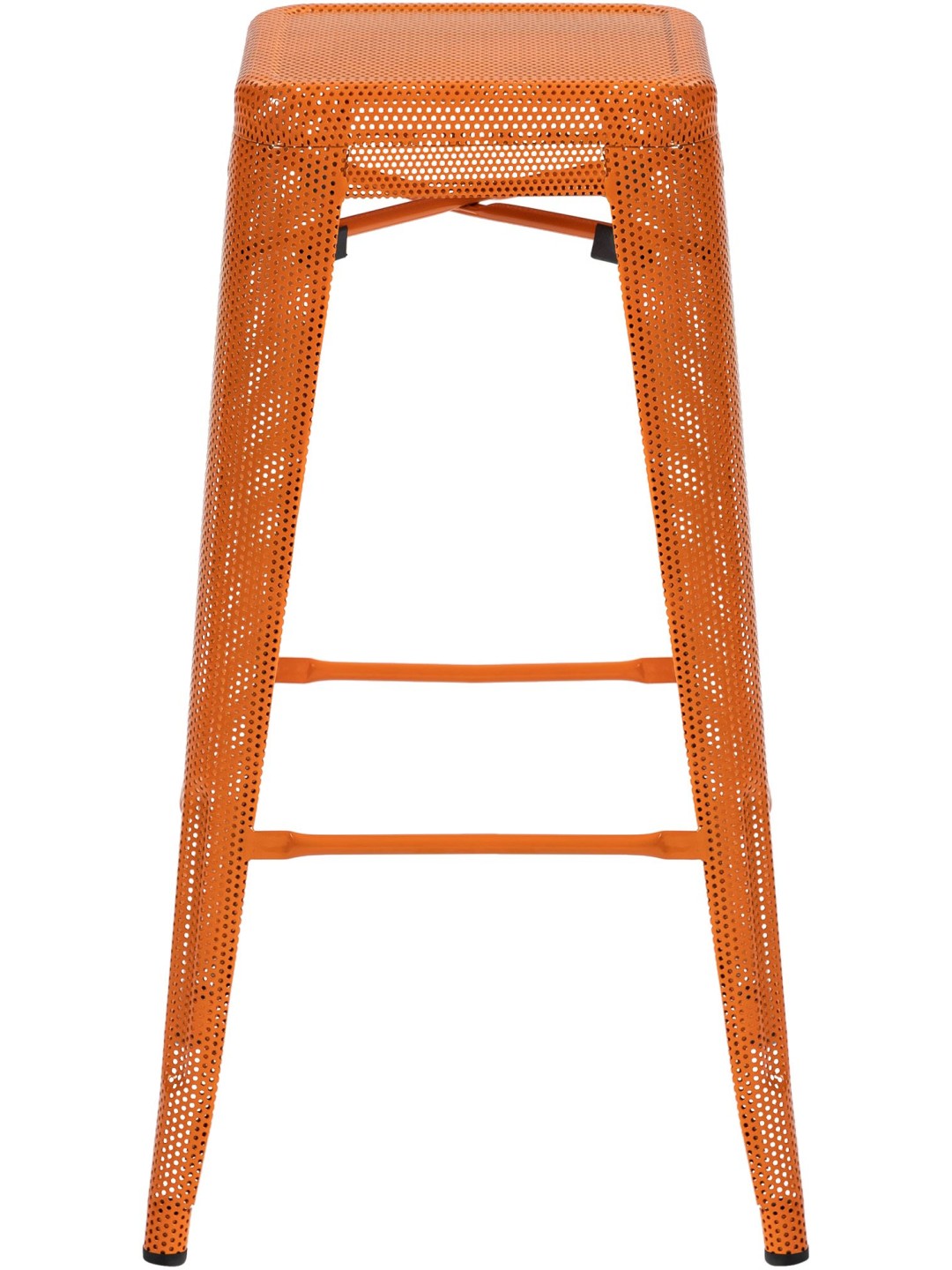 Udstyret med en perforeret metalramme kombinerer denne stol visuel lethed med stabilitet og understøtter en belastningskapacitet på op til 120 kg. Den har også en fodstøtte for forbedret siddekomfort. Den er stabelbar og er derfor særdeles velegnet til steder med begrænset plads. Sædehøjden er 77 cm, hvilket betyder, at den passer under enhver bar og et højt bord. Gulvbeskytterne beskytter gulve mod ridser og sikrer stabilitet. Taburettens materiale er let at vedligeholde, hvilket gør den til et praktisk møbel til hverdagsbrug, både i hjemmet og i cateringsektoren. Dets industrielle design passer ind i moderne indretningsstile.