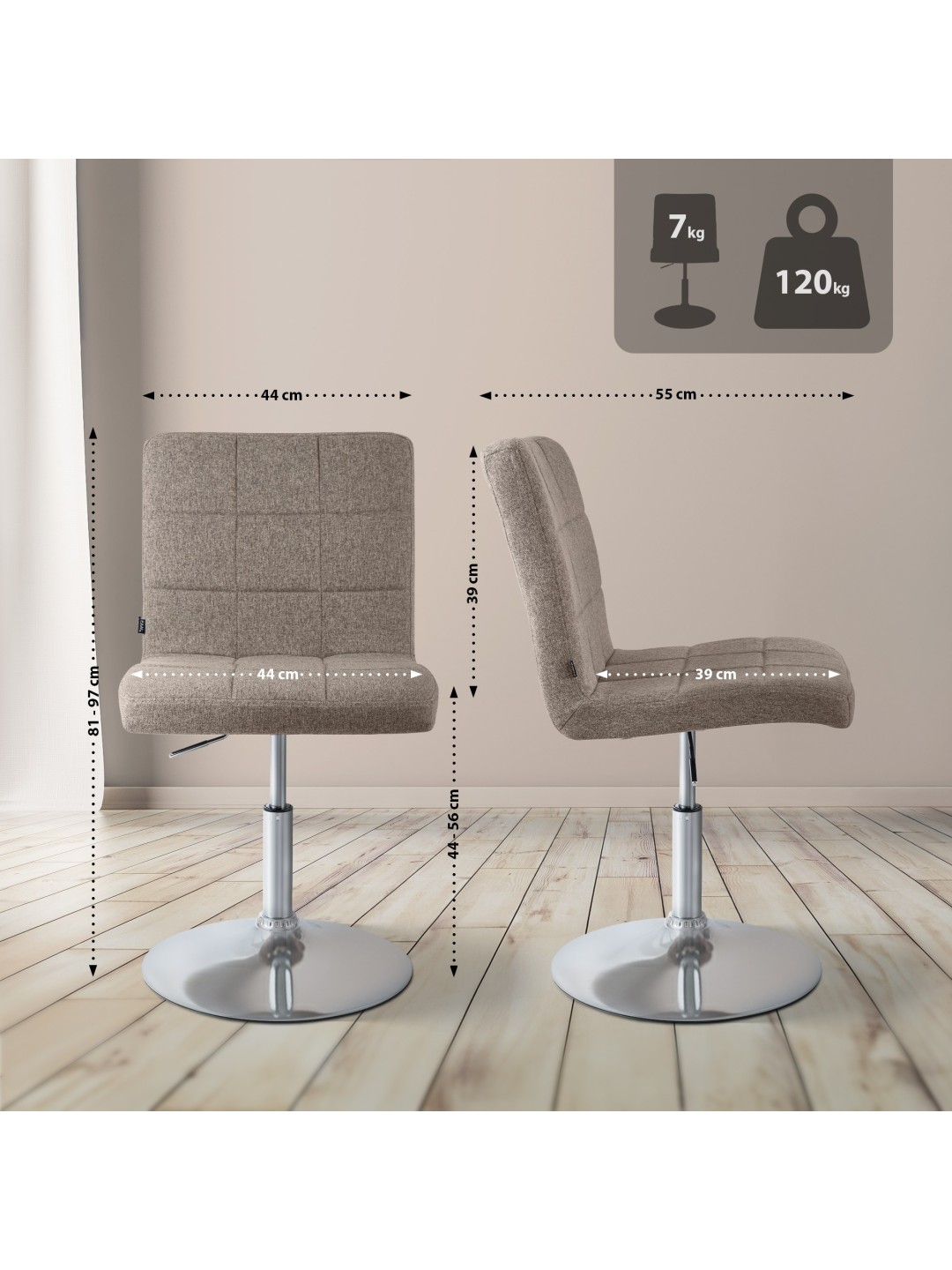 Lænestolen er både højdejusterbar og drejelig 360° og lover derfor mere fleksibilitet. Stellet er lavet af metal med krom look og der er gulvbeskyttere under trompetbunden for at undgå at gulvet bliver ridset. Denne polstrede stol giver et moderne flair og komplementerer ethvert boligmiljø vidunderligt.