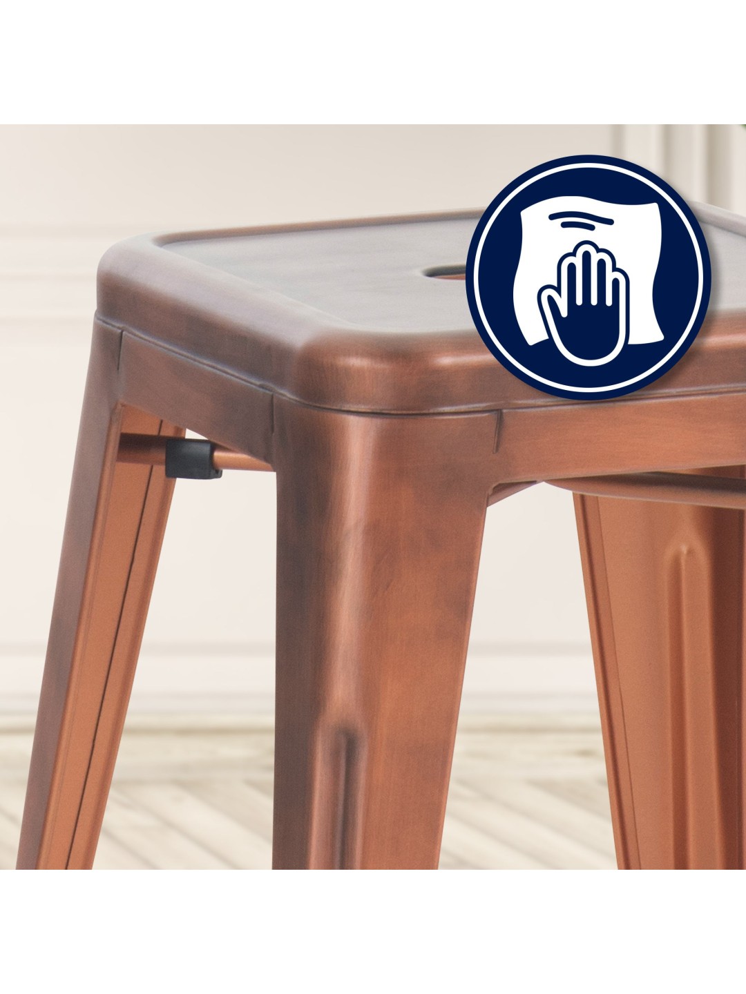 Den er lavet af robust metal, der er særdeles slidstærk og kan holde op til 200 kg. Den plejevenlige overflade kan let rengøres med en fugtig klud. Gulvbeskyttere på fødderne beskytter følsomme gulve mod ridser.